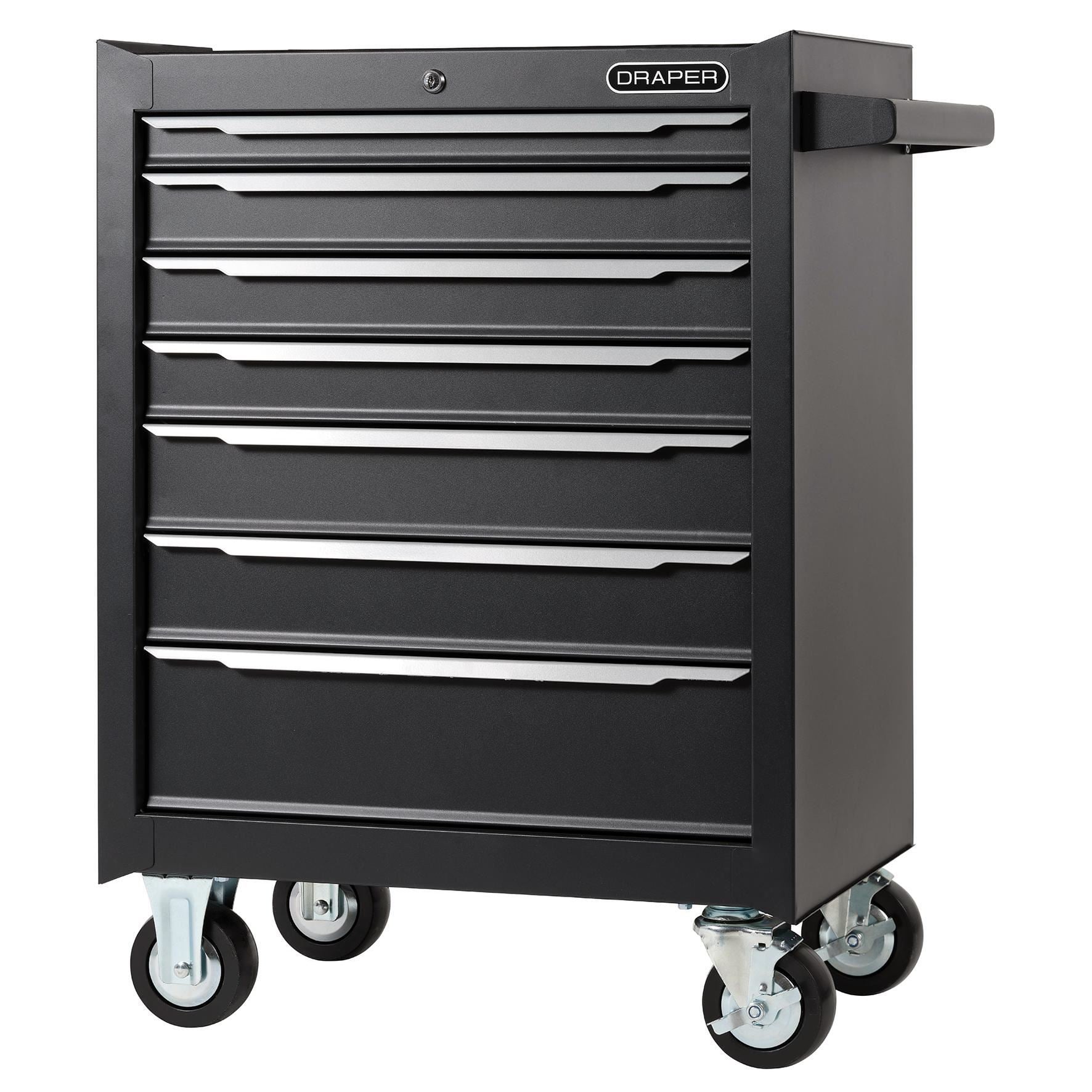 This practical 7-drawer roller tool cabinet is constructed from sheet steel and has a protective powder coated finish that guards against scratches and corrosion. The spacious drawers have a stylish aluminium trim and are equipped with ball bearing sliders for smooth operation and a 2mm EVA liner to protect tools and prevent them from sliding around. The worktop is also lined with EVA for added protection. For easy manouverability, the cabinet includes a sturdy pull handle and is fitted with four large steel castors - two fixed and two swivel with brakes. For security the cabinet has an integral lock to safeguard tools and comes with two keys.