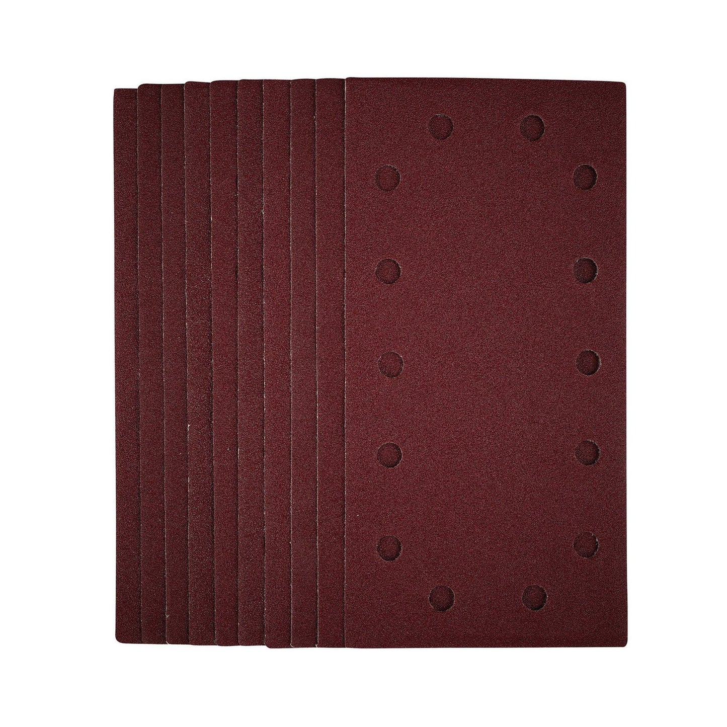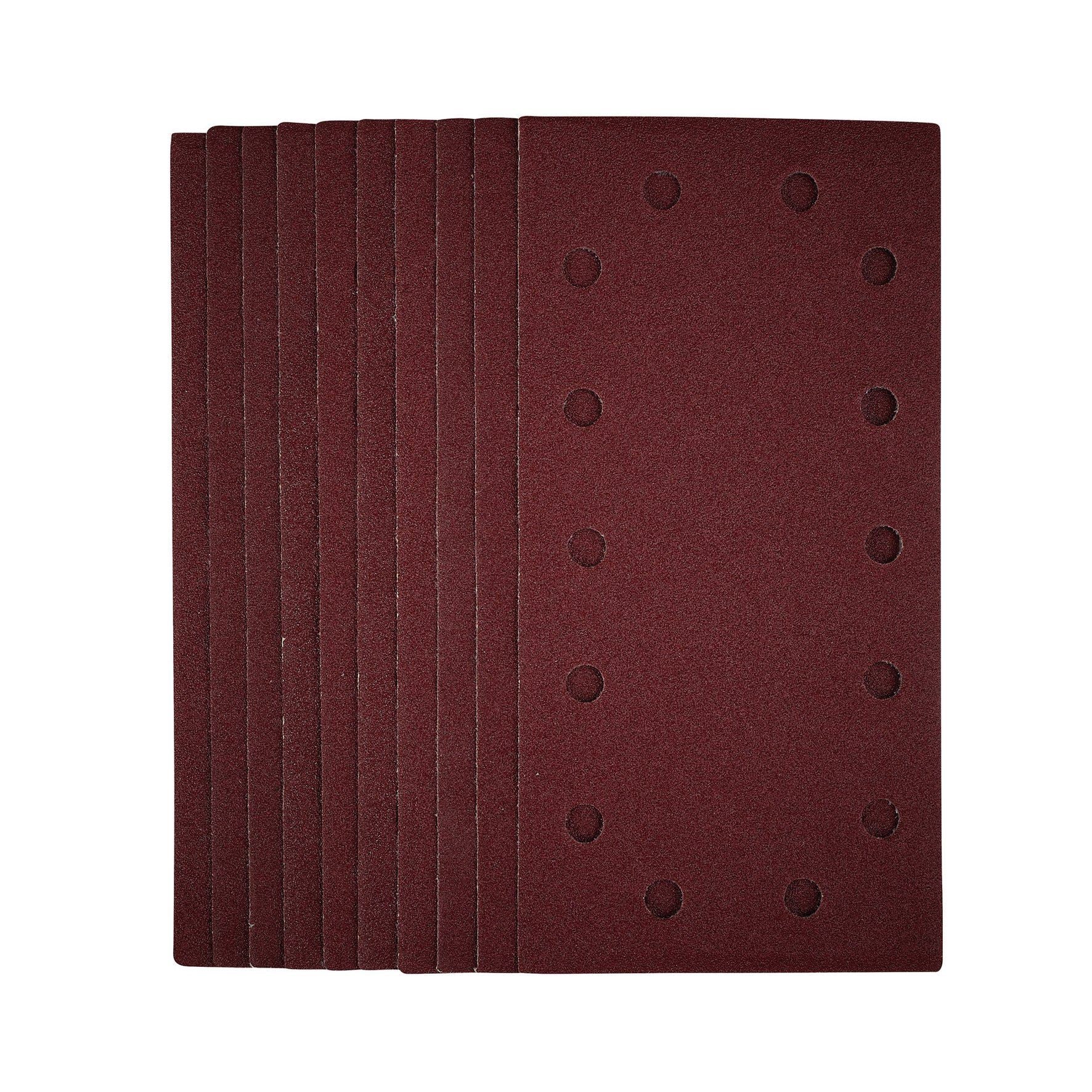This pack of 1/2 sanding sheets (115 x 230mm) are made from premium quality aluminium oxide that is resin bonded to provide improved grain adhesion, anti-static qualities and long-lasting performance. The heavy-duty E-Weight backing paper makes the sanding sheet more durable - able to withstand the toughest jobs. The hook and loop backing offers decent adhesion to facilitate the fast changing of sanding sheets. The 14 pre-punched 8mm holes improve dust extraction. Ideal for sanding and finishing wood, metal, aluminium alloy, painted surfaces, plastic and fillers. Compatible with most 1/2 sanders with hook and loop including Stock No. 57941.