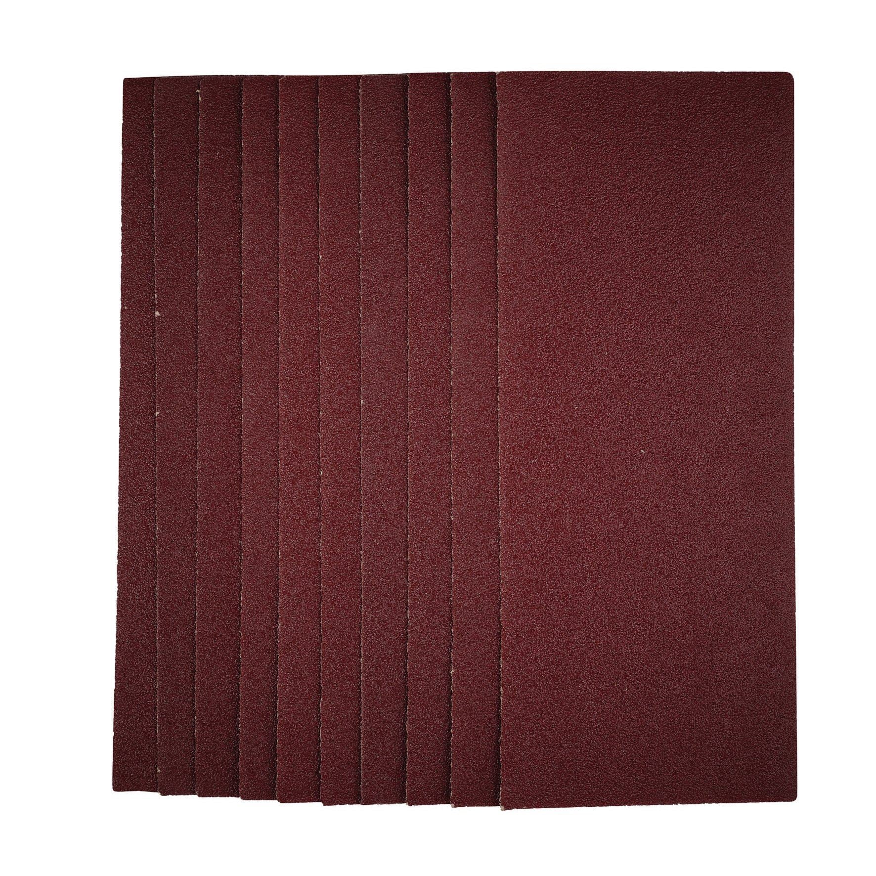 This pack of 1/2 sanding sheets (115 x 280mm) are made from premium quality aluminium oxide that is resin bonded to provide improved grain adhesion, anti-static qualities and long-lasting performance. The sheets are pre-cut to fit 1/2 sanders with clamping function (115 x 230mm). The heavy-duty E-Weight backing paper makes the sanding sheet more durable - able to withstand the toughest jobs. Ideal for sanding and finishing wood, metal, aluminium alloy, painted surfaces, plastic and fillers. Compatible with most 1/2 sanders including Stock No. 57941.