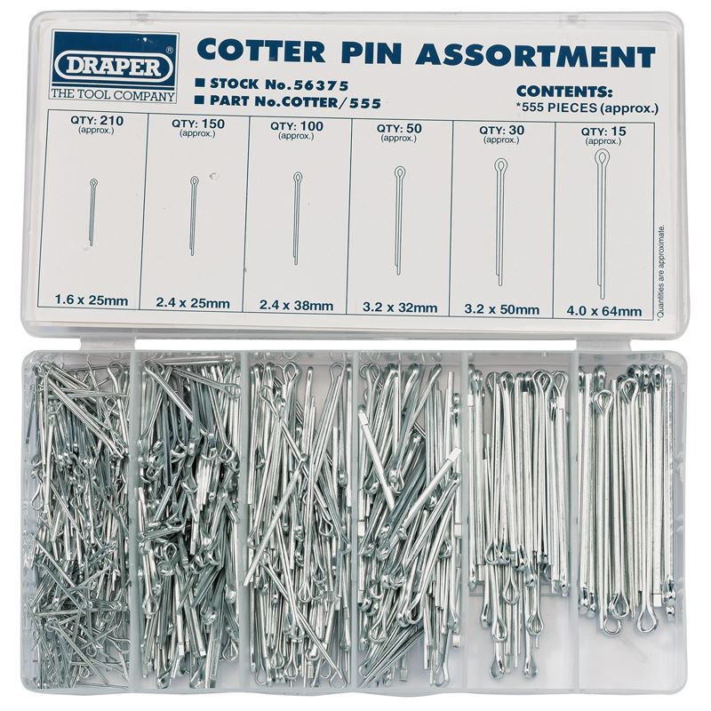 Assortment of zinc plated split pins in plastic storage case. Display carton.