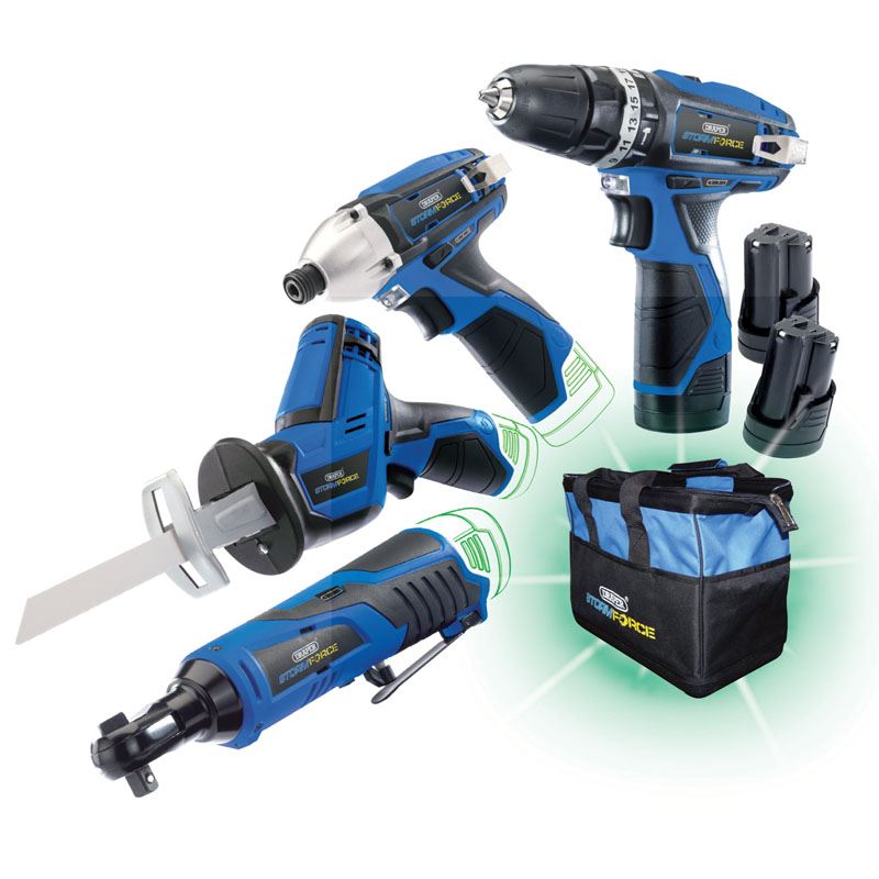 Draper Stormforce 10.8V 4pk 3 Batt, Drill, Impact driver Recep Saw Ratchet 52023