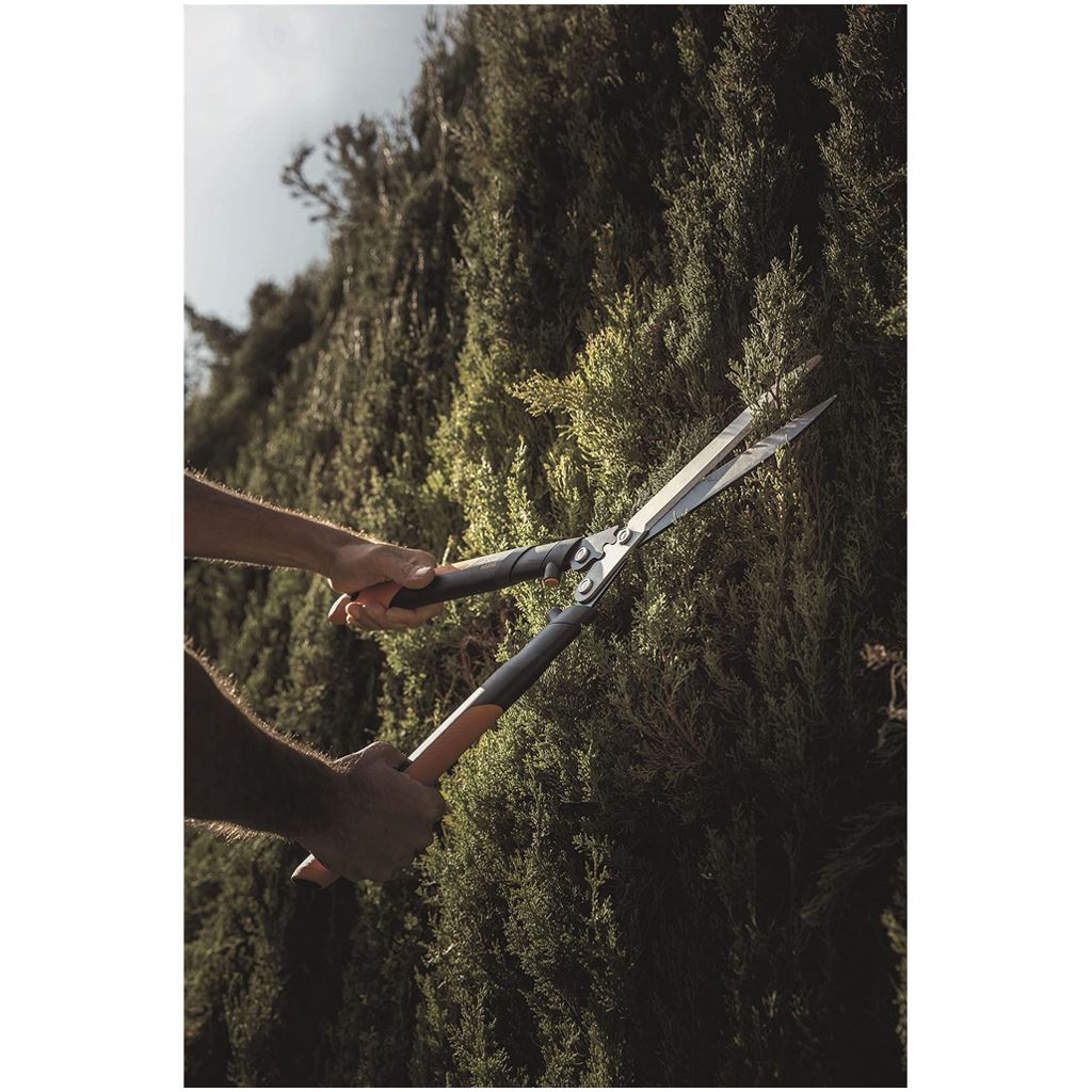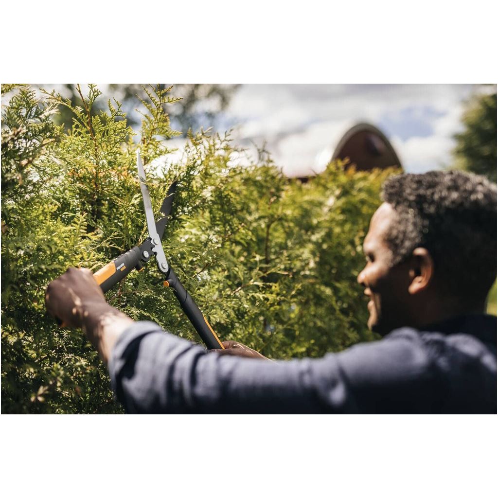 Hedge shears for trimming and carving hedges, shrubs and bushes, For right-handed and left-handed users | Easy to use thanks to lightweight and robust plastic handles with impact-resistant stops, Firm and comfortable grip thanks to ergonomic handles with structured non-slip coating | Effortless operation thanks to cutting performance 3 times easier compared to standard mechanisms, Smooth and clean cutting thanks to non-stick coating on the cutting blade | Long life product, Steel blades, Easy sharpening of the cutting blade, Diamond file sold separately in the maintenance kit (available under reference number 1001640), Finnish design | Contents: 1x Fiskars PowerGear X Hedge Shear HSX92, Length: 63 cm, Weight: 1.1 kg, Material: High Steel/fibreglass reinforced plastic, Colour: Black/Orange, 1023631