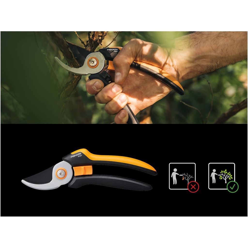 Bypass Garden Pruners for fresh branches, twigs of rose bushes or ornamental plants up to � 2 cm, Not suitable for dry and hard twigs, Ideal for right- and left-handers - High-quality workmanship: Smooth and clean cuts thanks to non-stick coating on cutting blade, Robust blades made of hardened steel - Sturdy and ergonomic SoftGrip handles made of glass-fibre reinforced plastic without PVC, locking mechanism for safe transport and storage - High durability, Easy resharpening of the cutting blade, Separately available diamond file in the care set (art. no.: 1001640), Finnish design - Contents: 1x Fiskars Solid Bypass Garden Pruners L, P341, Length: 20.5 cm, Weight: 172 g, Material: High-quality steel/anti-stick coated, Colour: Black/Orange, 1057164
