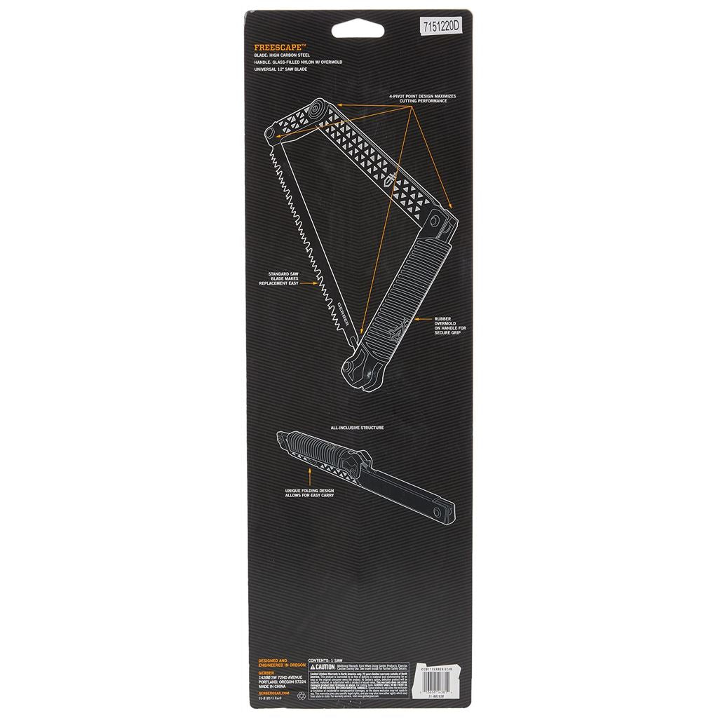 The Freescape Camp Saw features an innovative design that allows the saw to fold up flat while remaining completely assembled and without threat of lost parts. It utilizes 4 pivot points to effectively cut larger diameter wood while using the full length of the blade. When folded up, the blade is protected and can be stowed safely in a gear kit or camp bin. BRIGHT ACCENTS FOR QUICK VISUAL ID Its bright green accents along the black rubber surface make it easy to spot in the shuffle of camp gear. The grippy rubber Freescape textured handle stays firmly in the hand no matter the conditions. Replace the saw's standard 12" blade easily if required Box Contains1 x Folding Saw