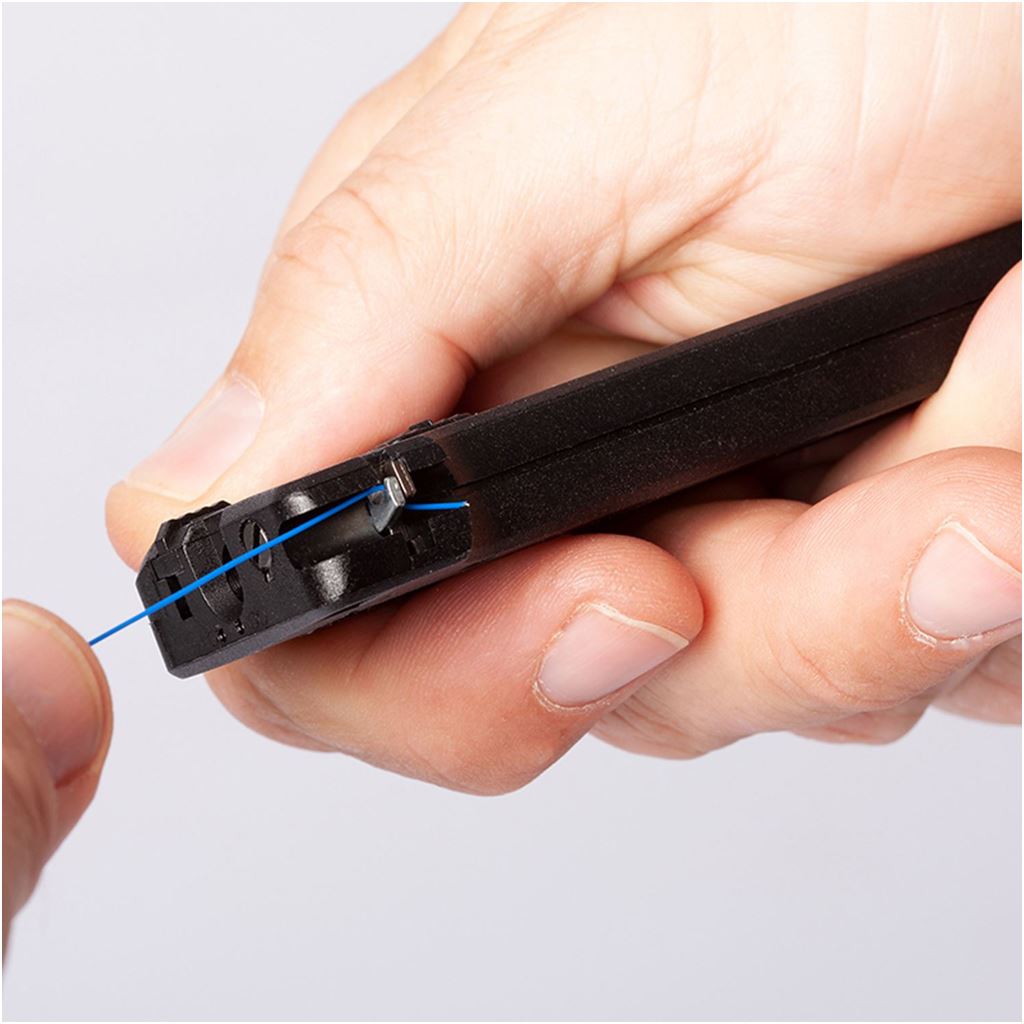 For all PVC -insulated solid and stranded wires with diameter from 0.12 to 0.40 mm �, AWG 36 ~ 26. Working range 0.12-0.16-0.20-0.25-0.30-0.40 mm �. Body made from special dissipative thermoplastic material. ESD. Ideal for wires with PVC, Teflon, KYNAR, TEFZEL, MYLAR, outer sheath. For use in telecommunication, model construction, security applications, data control applications, low voltage applications, computer networking. With adjustable length stopper up to 15 mm. Integrated cutter for wire diameters of up to 0.8 mm �. TUV / GS approved.. .