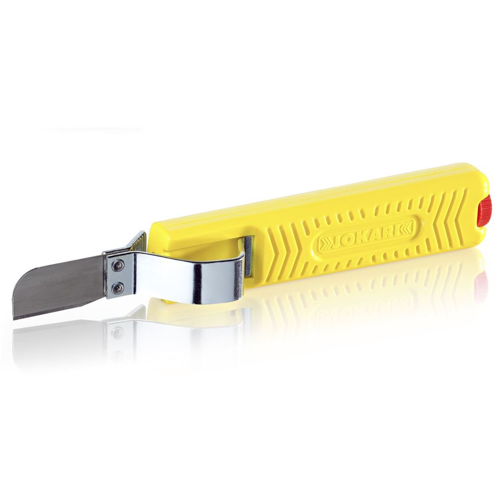 For stripping all standard round cables 8 ~ 28 mm (5/16" ~ 1.1/8"). Knifes with special Titanium-Nitride coating (TIN) to achieve longer life, faster cutting and less wear. The large adjustment screw allows for effortless adjustments. Automatic adjustment from round~ to length cut. Including TIN coated spare blade in the handle. With TIN coated straight blade.