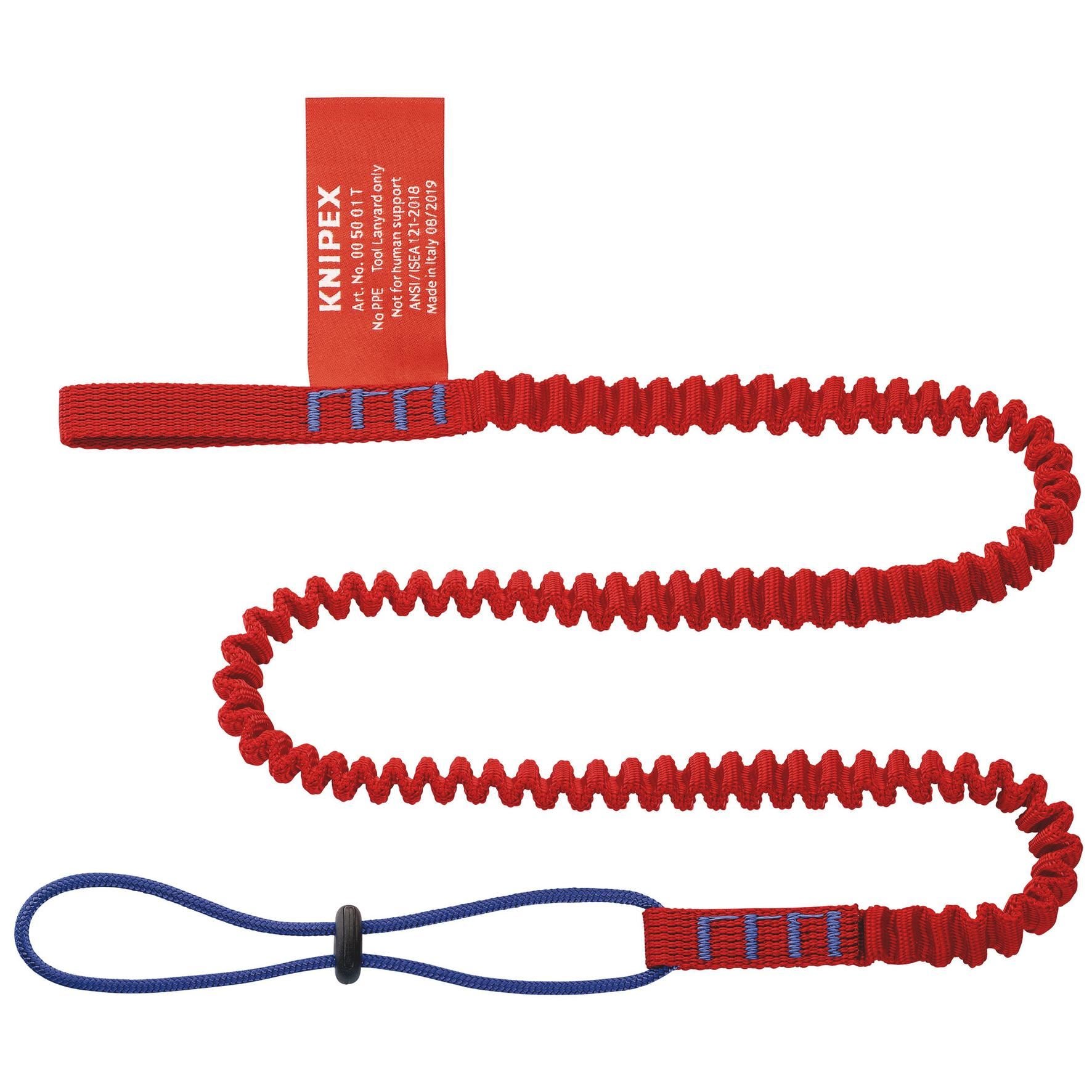 00 50 01 T BK Lanyard For reliable tool protection: holding capacity for tools up to 1.5 kg tested in numerous drop tests. Large working radius: long lanyard for convenient working. Reduces the risks of tool loss, injury to living beings and damage to objects. To meet regulations while working at heights, for example industrial climbing, arborists, rescue services, at sea, etc Lanyard can be attached directly wih the cord or the carabiner to climbing equipment or fixed points provided for this purpose, quick change of the belay from the tool bag to the tether. The roughly 90 cm long gathered fabric strap tether stretches to a length of about 1.5 m when weight is applied. With strap made of a flat belt sewn to one end and a cord and cord stopper sewn into the other end. Suitable for all KNIPEX pliers with tether attachment point. No PPE (personal protective equipment): not suitable for personal safety!. - Load capacity: 1.5 kg / 3.3 lbs