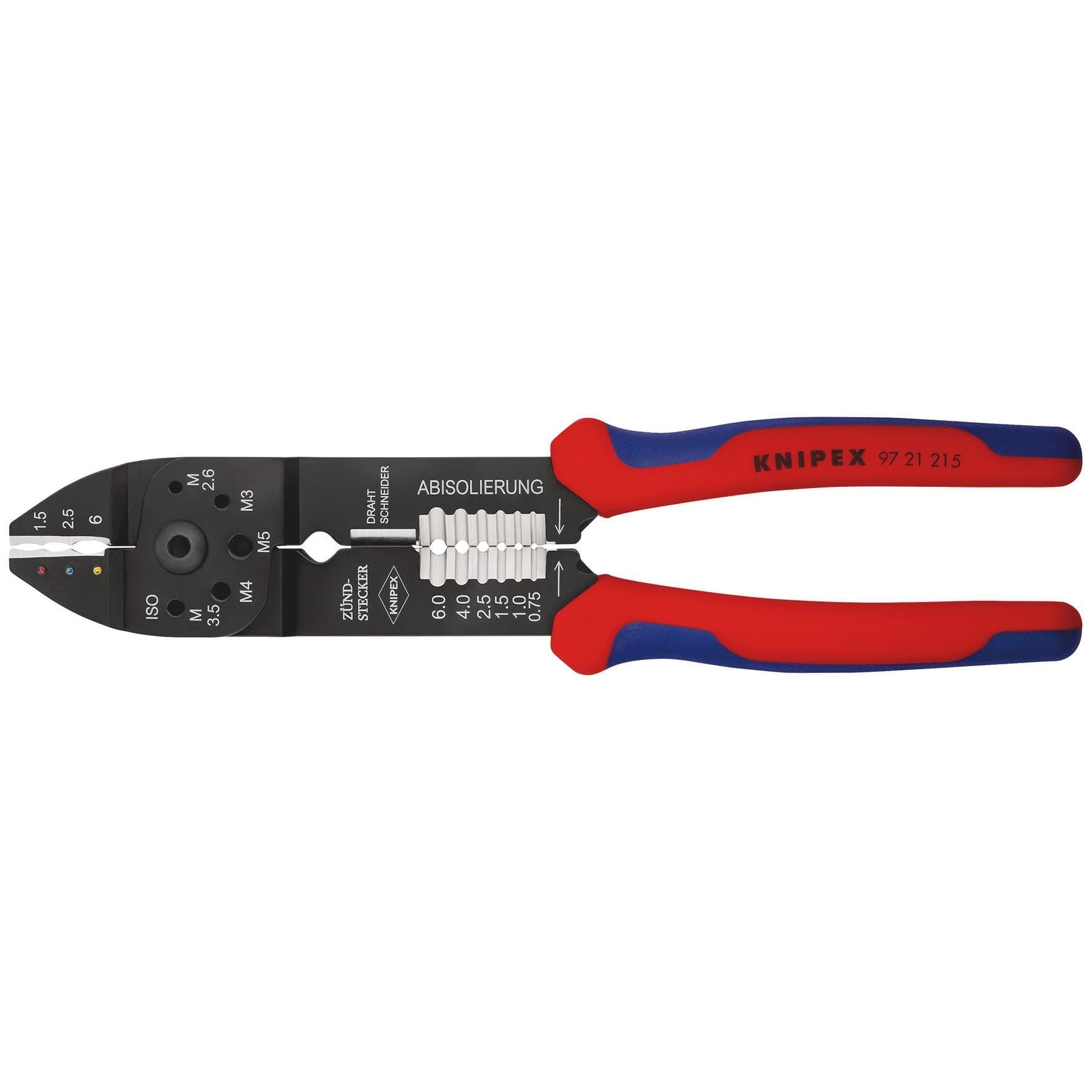 97 21 215 SB Crimping Pliers For cutting cables, stripping wire and crimping insulated terminals and heat shrinkable sleeve connectors. With threaded holes for cutting copper and brass screws threaded M 2.6 / M 3 / M 3.5 / M 4 and M 5. Bolted joint for higher stability and even movement. - Application: insulated terminals + cable connectors- Capacity in square millimetres: 0.56.0mm²- Number of crimp profiles: 3- AWG: 2010