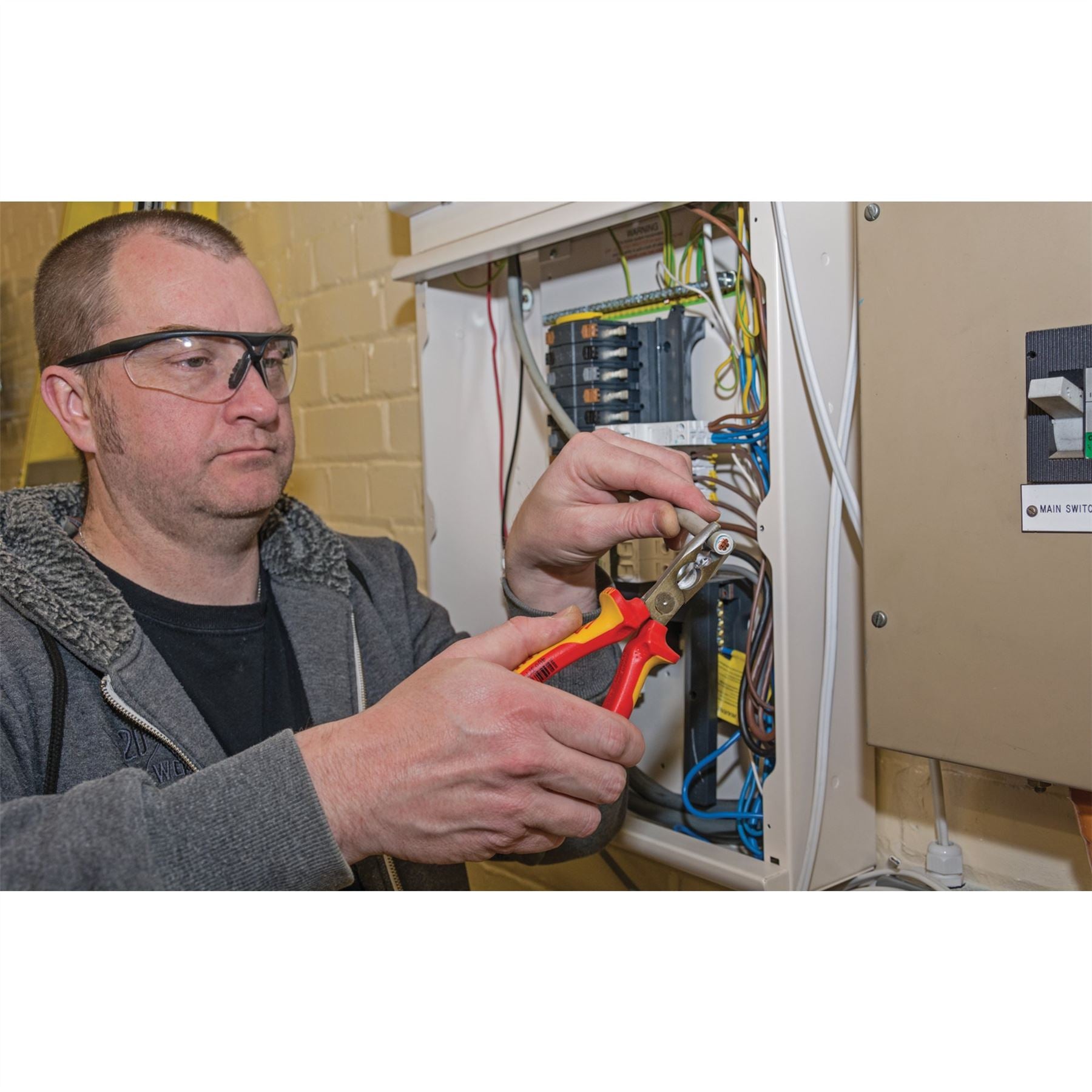Professional Quality, tested to 10,000V and insulated to 1000V AC and 1500V DC for live line working. Thanks to its circular cutting edge they enable easier access into deep mounted junction boxes, easily stripping cables without damage. Universally useful, the precision 1.5 and 2.5 mm_ wire stripping holes and diagonal cutters used for conductors, wires, small screws and nails. All cutting edges are additionally induction hardened for a longer life. Manufactured from oil-hardened chrome vanadium steel. Perfect for dismantling and stripping round sheathed and damp-proof installation cables.