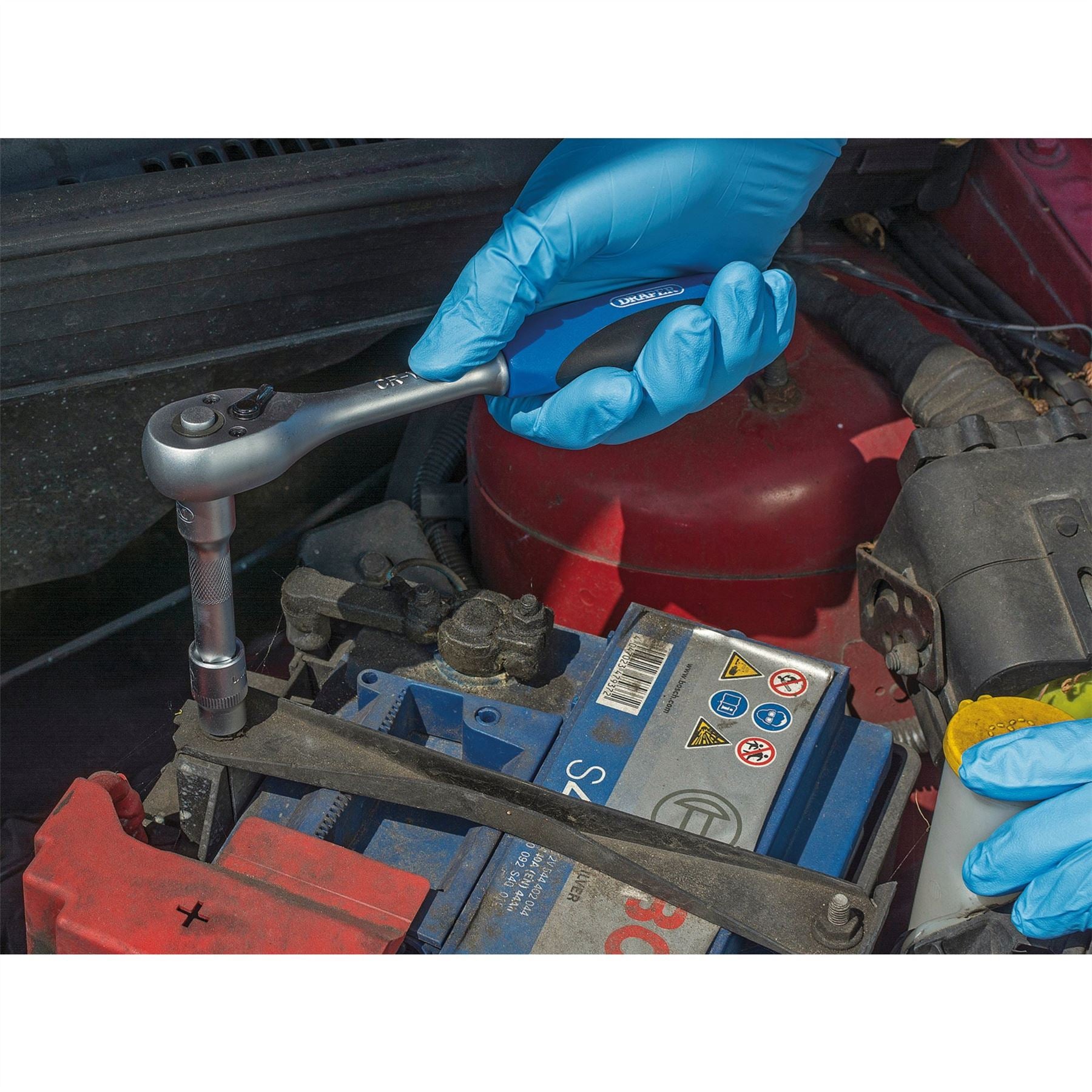 Six point sockets made from chrome vanadium steel that's hardened and tempered with a satin finish. Supplied with a 72 tooth reversible soft grip ratchet and accessories. Packed in a plastic storage case.
