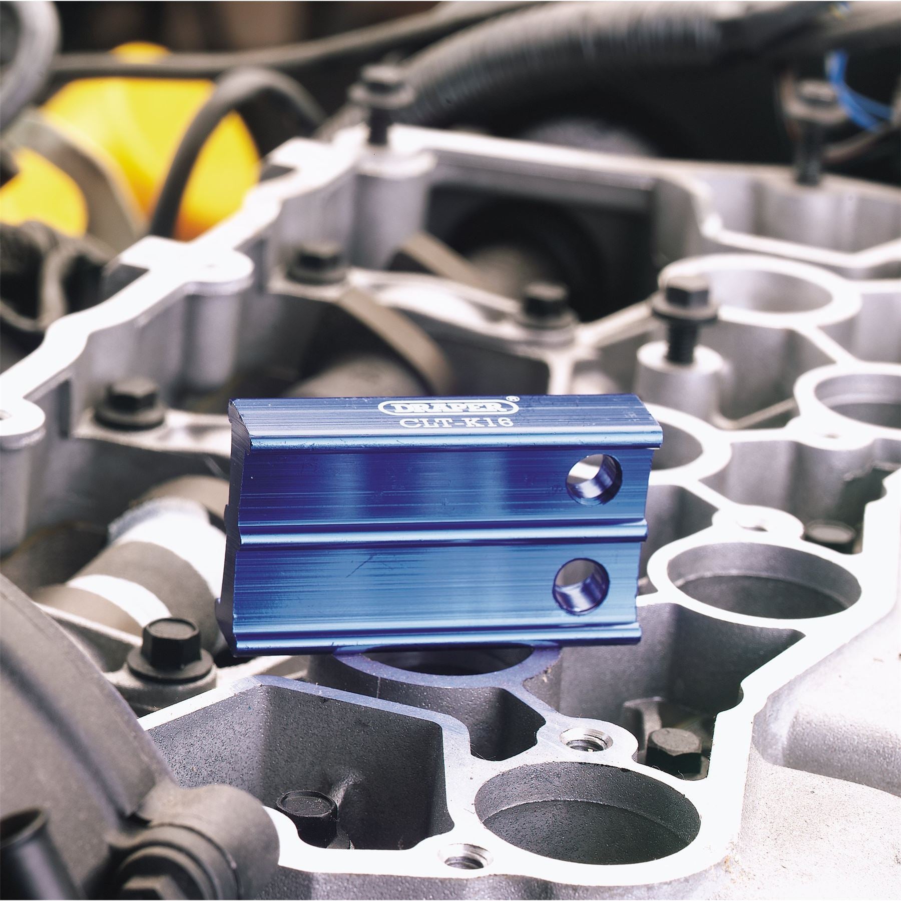 Locks camshaft when changing cam belts etc. For use with Rover Group Metro 1.4 (100 Series) GTa, GTi May 1990 on; Rover 214 16 valve Si, SLi, GSi Oct. 1989 on; Rover 414 16 valve Si, SLi, GSi March 1990 on. Manufactured from anodized aluminium. Display packed.