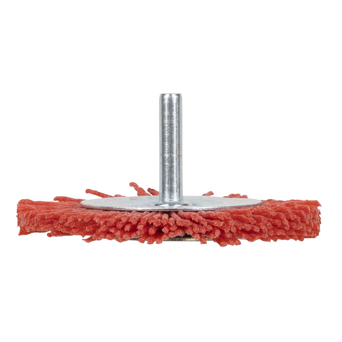 Nylon filament brush contains an abrasive grain designed for non-sparking application. Long-life span allowed by specially designed nylon filament material. For use when performing surface treatment, deburring and other cleaning applications on metal, wood and other surfaces. Designed to fit any standard sized drill chuck. Standard 6mm shaft size.