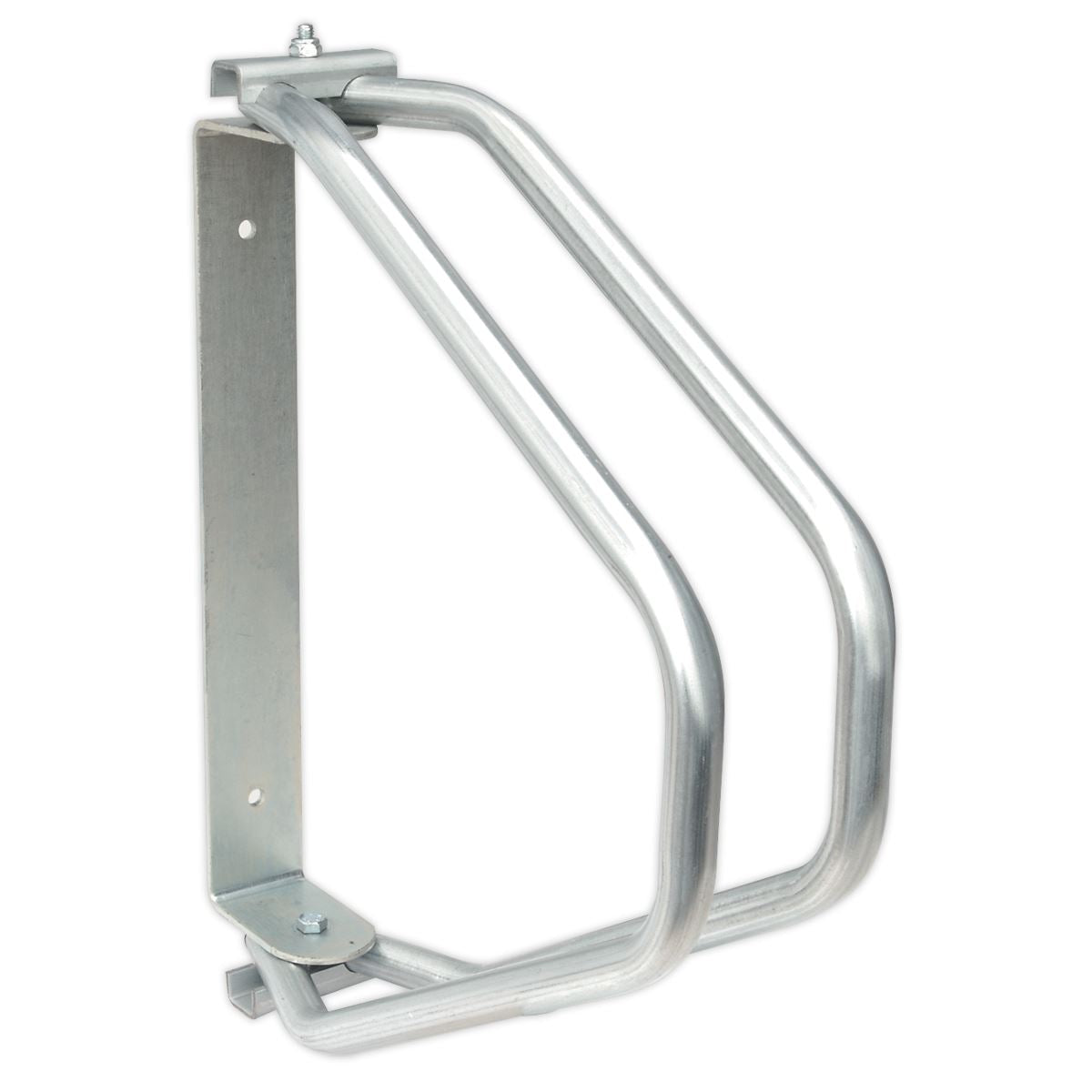 Wall mounting bicycle rack. Heavy-duty galvanized steel construction with 180 swivel movement.