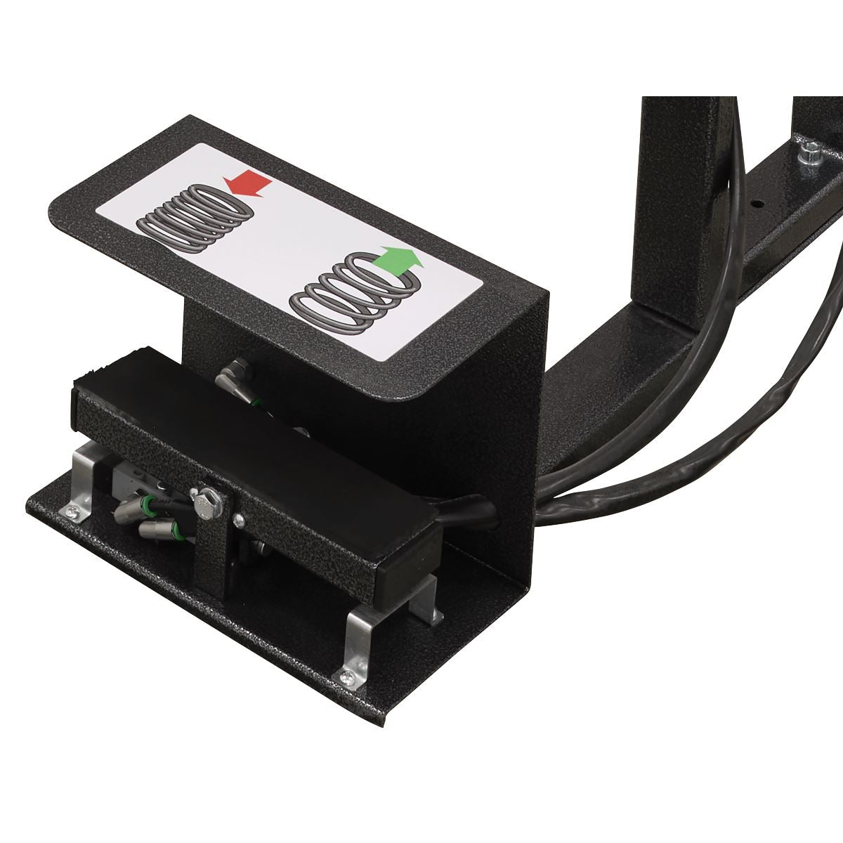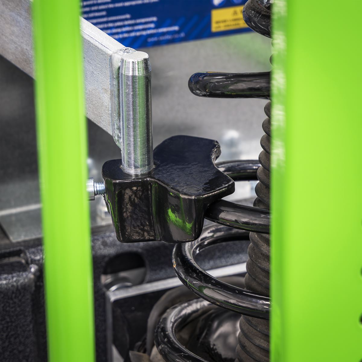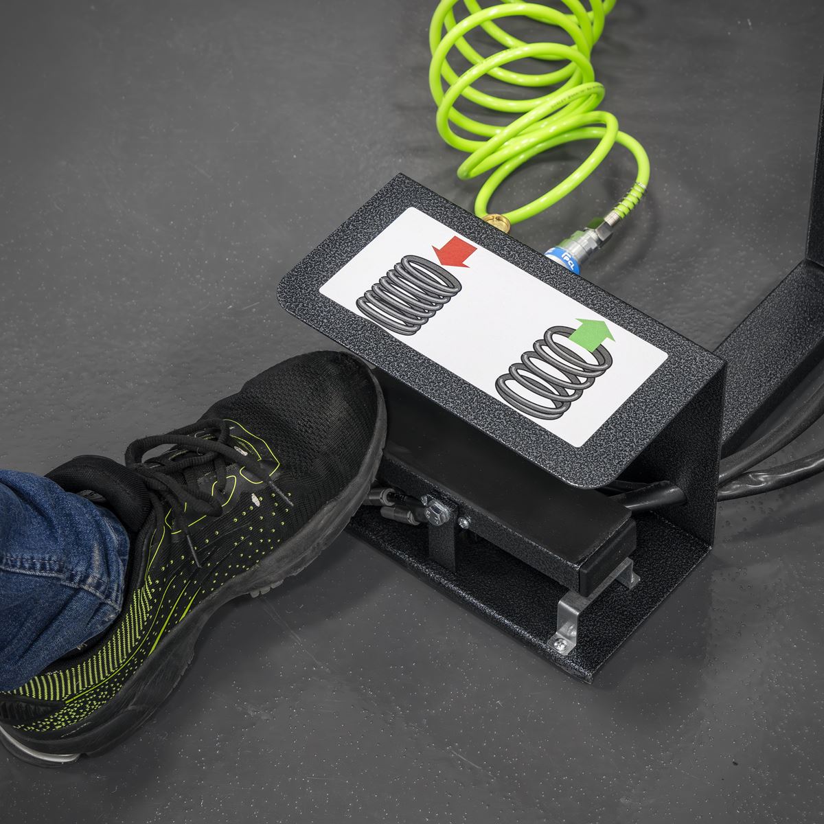 Designed for fast and safe compression of suspension coil springs. Air powered system operated by foot pump for ease of use. High-capacity unit featuring 2500kg maximum load. Features safety cage. Includes a suspension strut clamp. Fits a wide range of left and right-handed coil spring configurations and diameters.