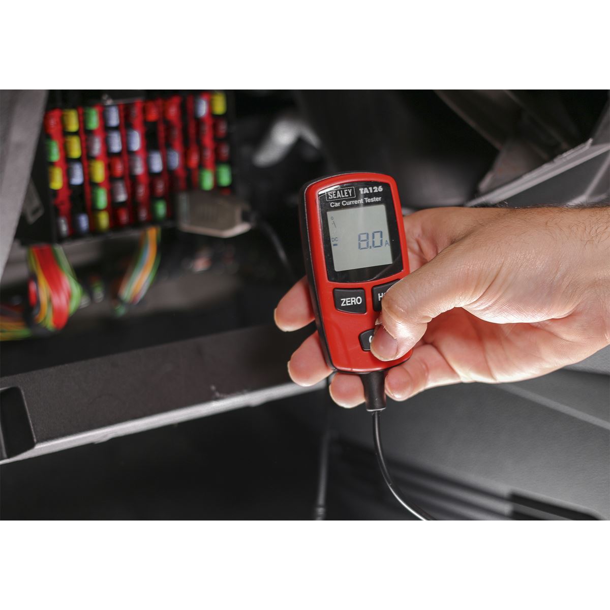 - Fast, accurate and safe current measurement at the fuse box or battery. - Ideal for fault-finding on car and commercial vehicle electrical circuits. - Features large LCD display with numeric and bar-type functions. - Plugs directly into the vehicle's fuse board. Supplied with mini, standard adaptors and fused crocodile clips. - Compatible with alternative probes using the standard 4mm banana adaptors. - Model No. TA126- Fast, accurate and safe current measurement at the fuse box or battery. - Ideal for fault-finding on car and commercial vehicle electrical circuits. - Features large LCD display with numeric and bar-type functions. - Plugs directly into the vehicle's fuse board. Supplied with mini, standard adaptors and fused crocodile clips. - Compatible with alternative probes using the standard 4mm banana adaptors.