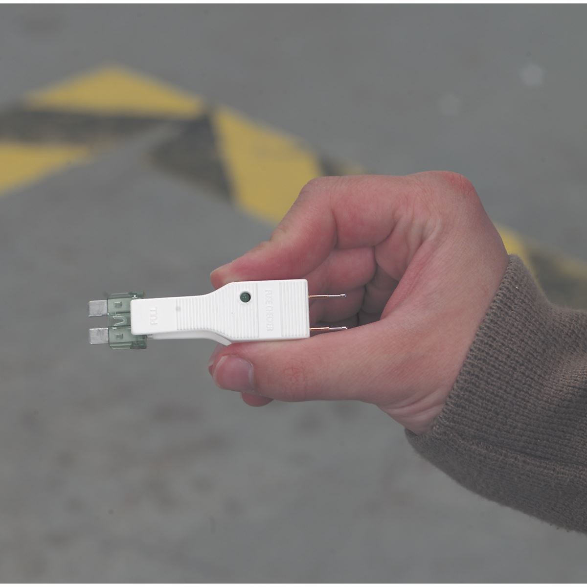 Checks continuity of blade-type automotive fuses, in or out of fuse holder. Green LED indicates fuse is OK. Also simplifies the removal of faulty fuses.