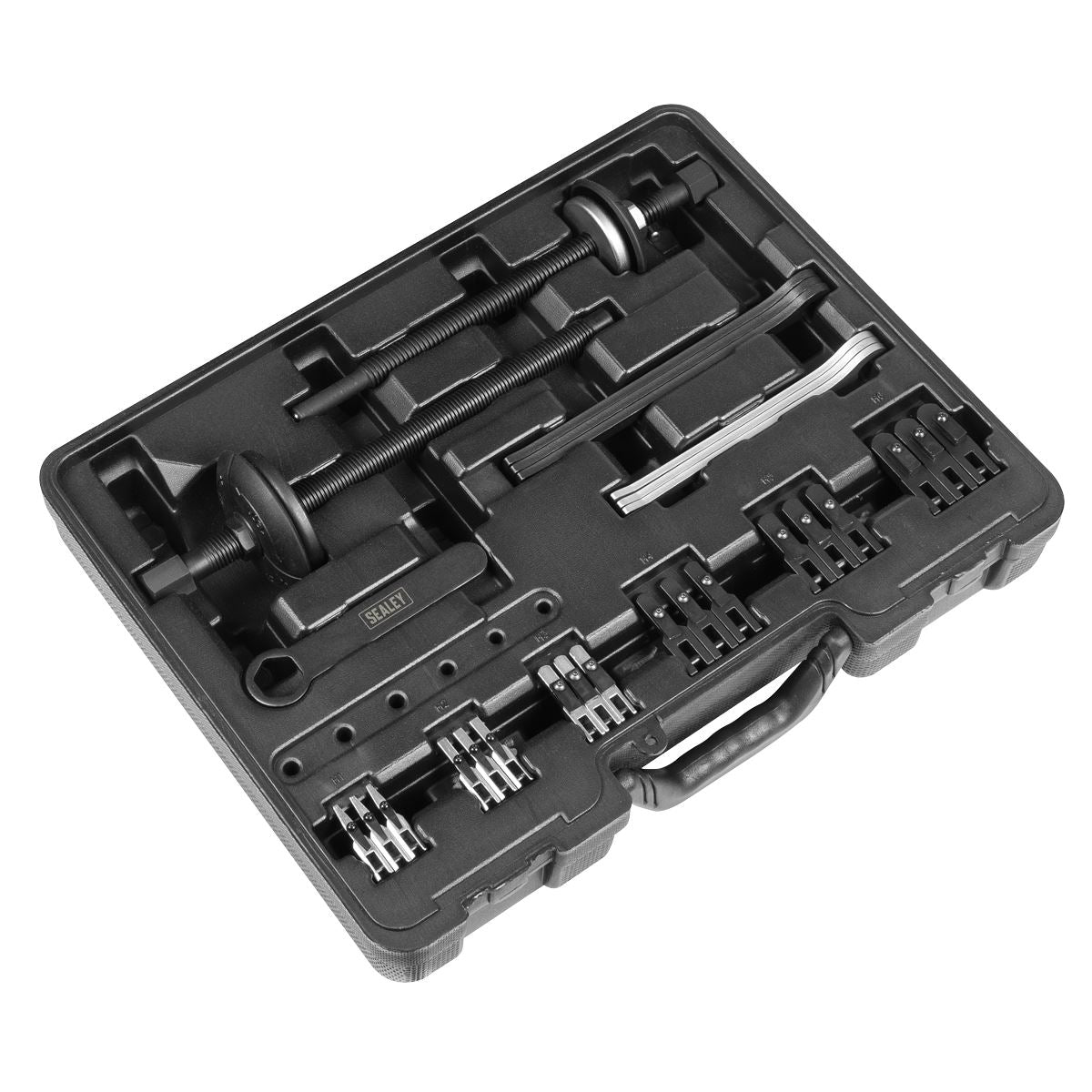 Suitable for gearboxes, electric motors, agricultural machinery and general machinery. Features reversible jaws allowing internal and external pulling operations. Adjustable shims for precise fit into the deep grove bearing. Ideal for use with a ratchet or spanner. Manufactured from high-grade steel for added strength and durability. Supplied in a storage case.