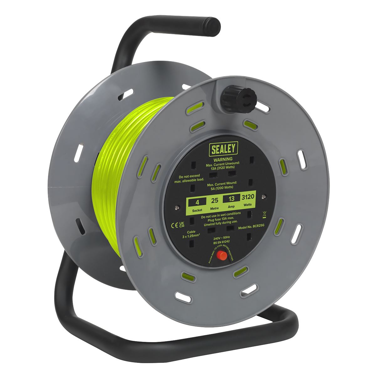 Sealey Cable Reel with Thermal Trip 4 x 230V Sockets 25m - Green BCR25G