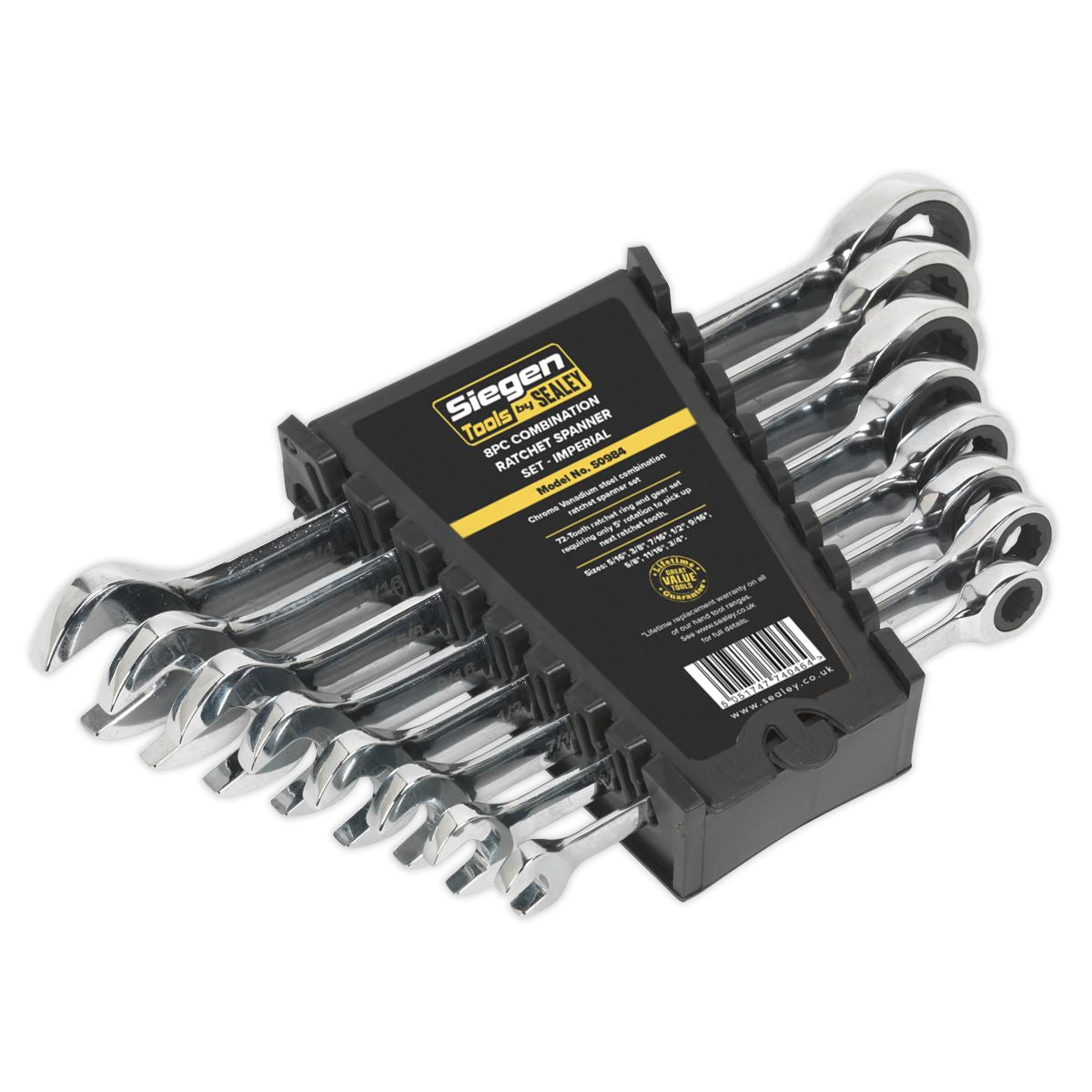 - Chrome Vanadium steel combination ratchet spanner set. - 72-Tooth ratchet ring and gear set requiring only 5 rotation to pick up next ratchet tooth. - Ideal for applications where space is limited. - Sizes: 5/16", 3/8", 7/16", 1/2", 9/16", 5/8", 11/16", 3/4". - Supplied in storage rack. - Lifetime guarantee*. - Model No. S0984- Part of the Siegen by Sealey range of quality tools at competitive prices. - Chrome Vanadium steel combination ratchet spanner set. - 72-Tooth ratchet ring and gear set requiring only 5 rotation to pick up next ratchet tooth. - Ideal for applications where space is limited. - Supplied in storage rack. - Lifetime guarantee*.