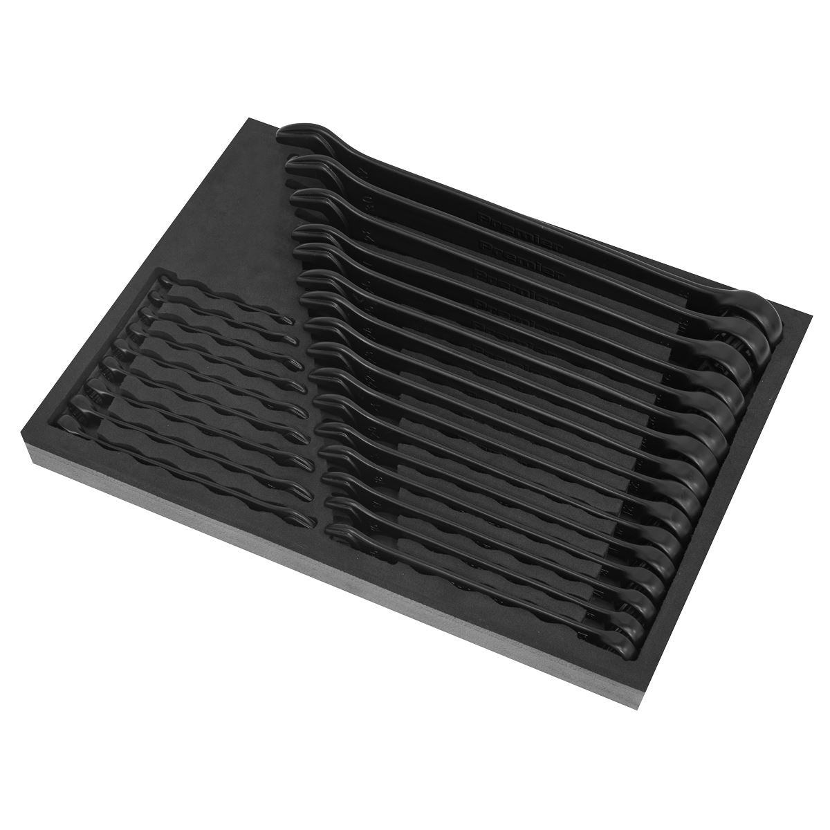 Drop-forged Chrome Vanadium steel spanners. Hardened and tempered with a black electrodeposition finish for corrosion resistance. 15 Offset open-end and WallDrive ring combination with long slim shafts. Supplied in an EVA storage tray.