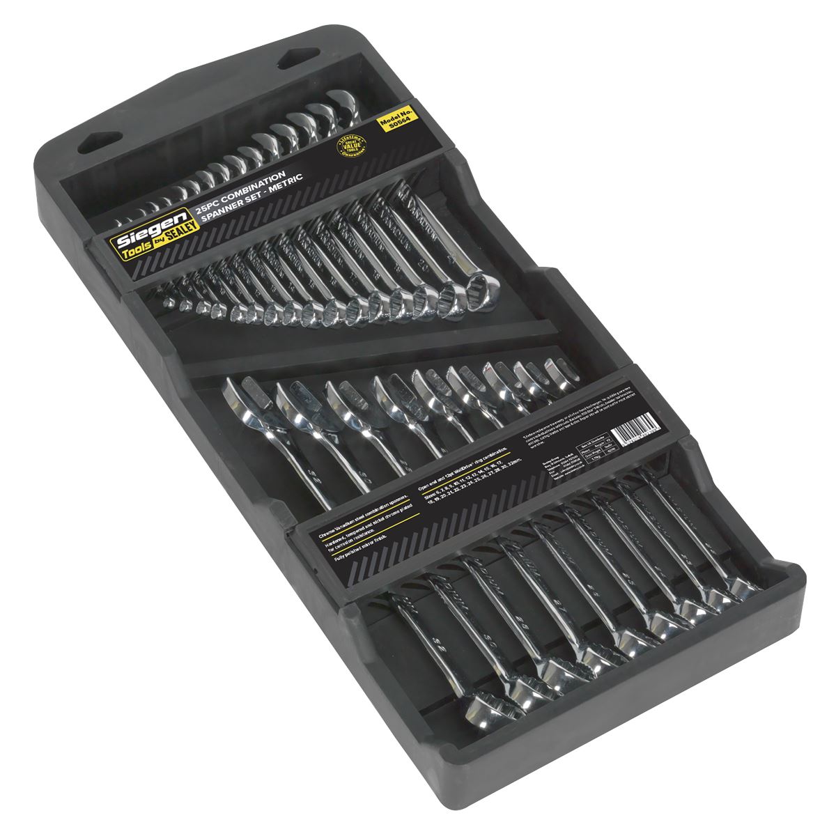 - Chrome Vanadium steel combination spanners. - Hardened, tempered and nickel chrome plated for corrosion resistance. - Fully polished mirror finish. - Open-end and 12-point WallDrive ring combination. - Sizes: 6, 7, 8, 9, 10, 11, 12, 13, 14, 15, 16, 17, 18, 19, 20, 21, 22, 23, 24, 25, 26, 27, 28, 30, 32mm. - Supplied in storage/carry rack. - Lifetime guarantee*. - Model No. S0564- Part of the Siegen by Sealey range of quality tools at competitive prices. - Drop-forged Chrome Vanadium steel combination spanners. - Hardened, tempered and nickel chrome plated for corrosion resistance. - Fully polished mirror finish. - Open-end and 12-point WallDrive ring combination. - Supplied in storage/carry rack. - Lifetime guarantee*.