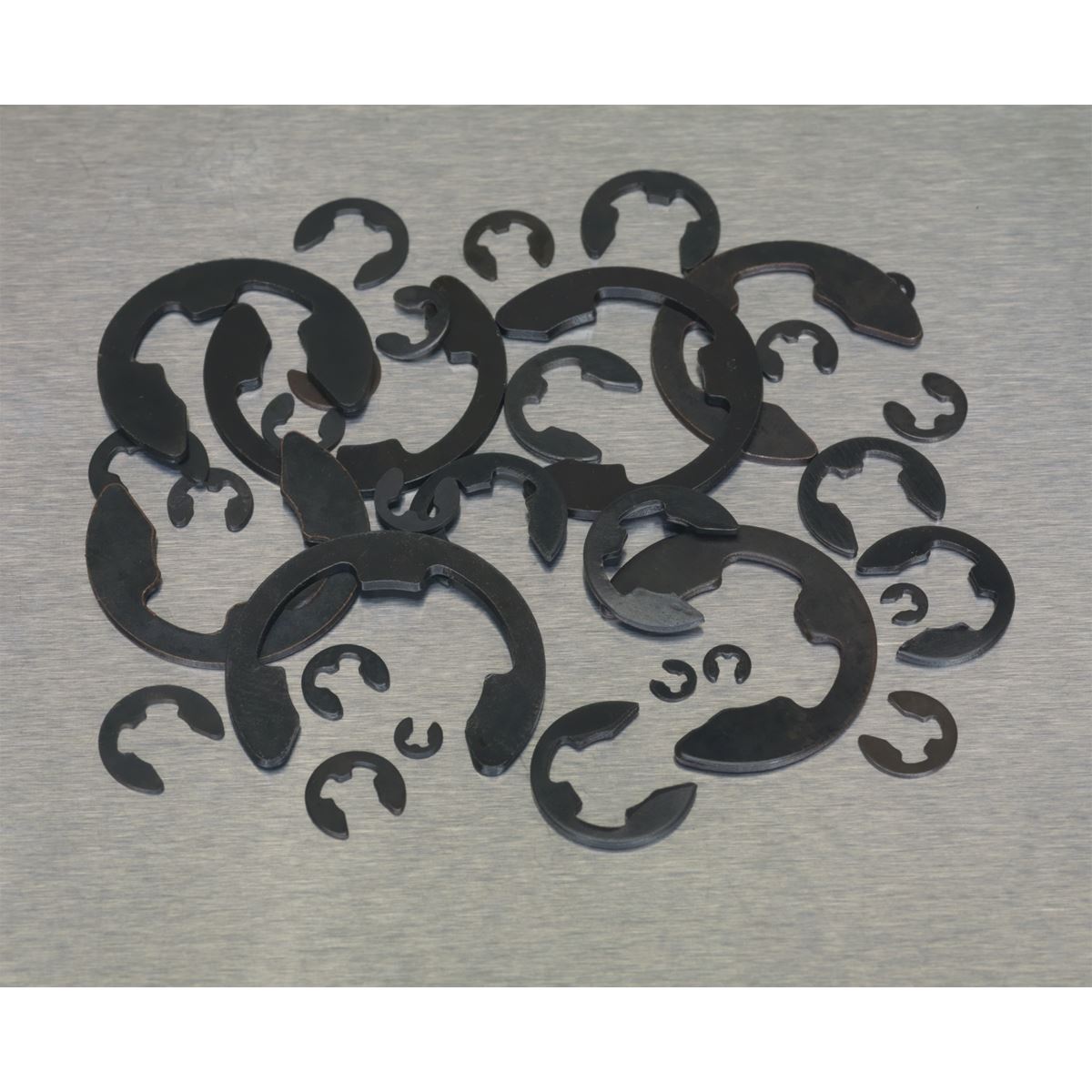 - E-clips assortment. - Contents (Approximate Quantity): (ID) 1.7 (x150), 2.75 (x150), 3.5 (x100), 4.5 (x100), 6 (x100), 7 (x80), 13 (x70), 15.5mm (x50). - Supplied in partitioned box. - Model No. AB012ER- E-clips assortment. - Sizes: Metric. - Quantity: 800 - Supplied in partitioned box.