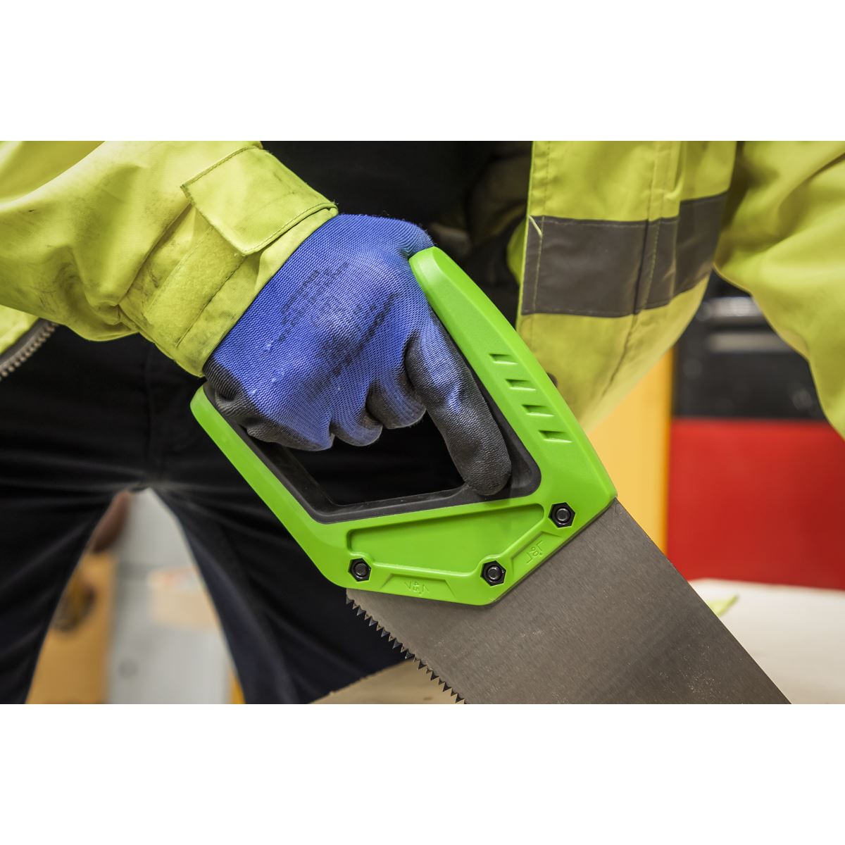 ABS and TPR anti-slip soft grip handle with finger rest for comfort and control. 1mm 65Mn High grade carbon steel blade. Hardened and tempered double ground teeth for fast and efficient cutting. Lacquered coating for reduced friction and corrosion resistance. 45� and 90� angle guides integrated into handle with useful 490mm ruler measurement along top edge of blade. General-purpose 7tpi blade suitable for timber, hardwood, MDF, chipboard and plastics.