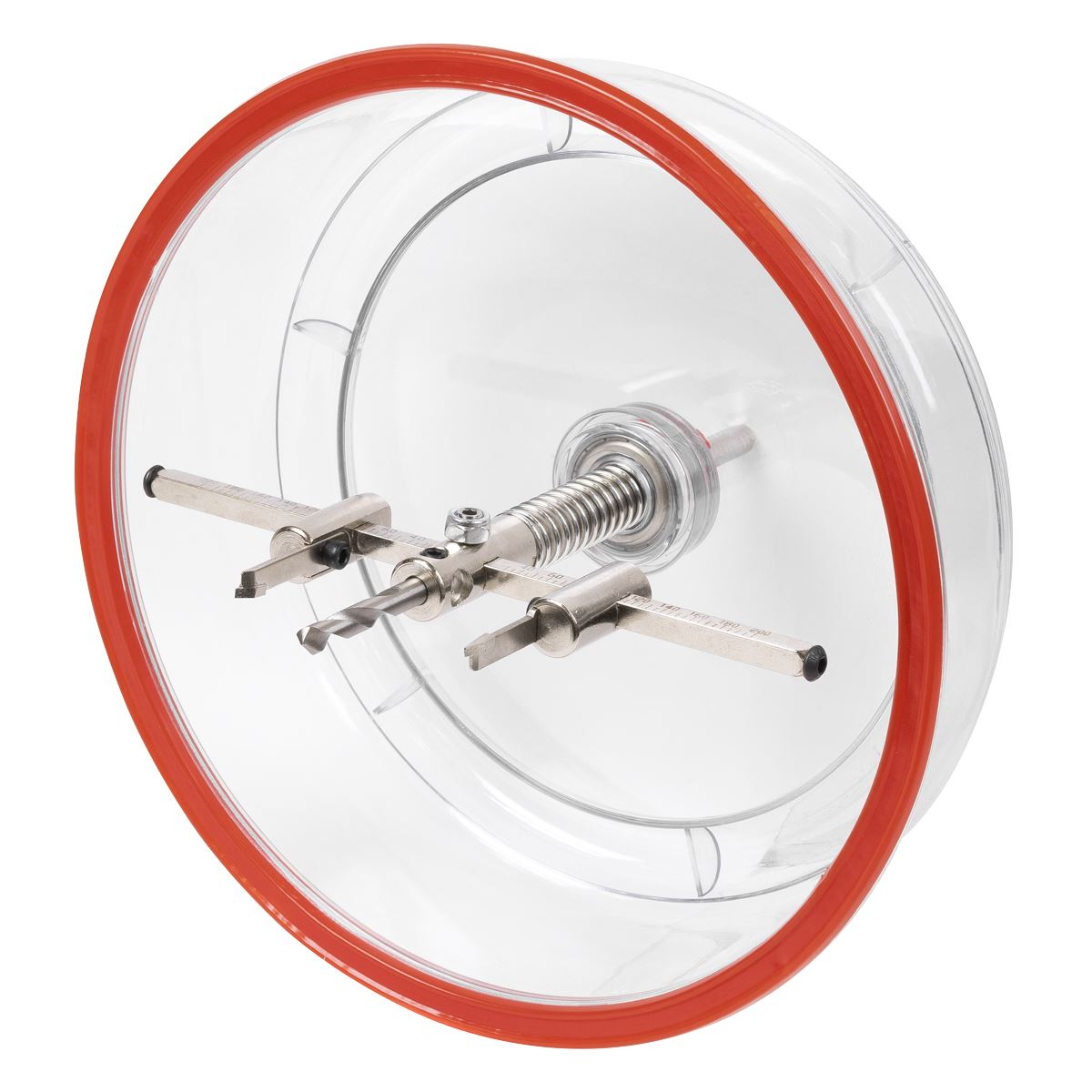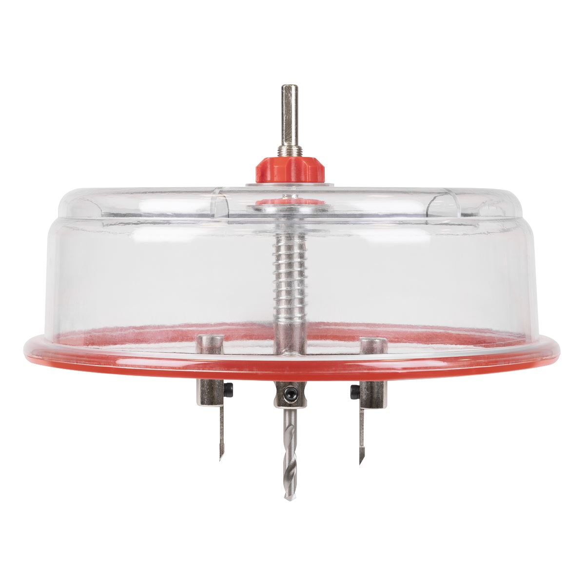 Steel body with adjustable blades for selectable hole diameters between 40-200mm. Hole cutter surrounded by strong plastic cowling. Designed to catch debris when cutting holes for down lighting, extractor fans and other applications. 10mm Shank with spring loaded mechanism to allow for depth variation. For use on materials such as drywall, wood, plastic, aluminium, brass and acrylic sheets.