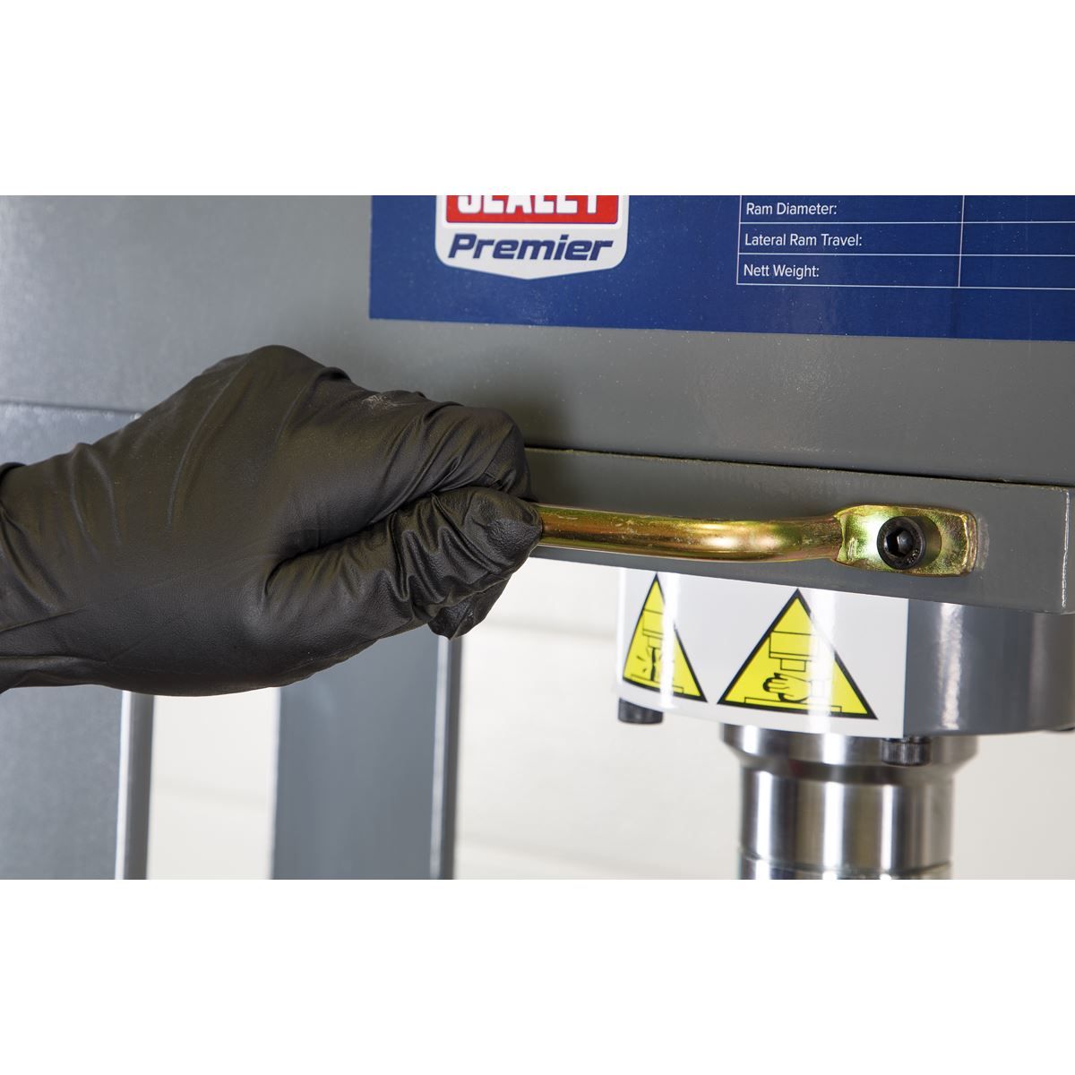 - Table Aperture: 164mm. - Working Table Width: 695mm. - Ram Stroke: 150mm. - Steel frame construction. - 2-Speed hydraulic pump unit. - Sliding hydraulic ram assembly giving 200mm of lateral travel for off-centre pressing applications. - Fitted with ram pressure gauge. - Supplied with flat pressing plate/V-blocks. - 2 Year guarantee*. - This item is heavy. Extra assistance must be provided at the delivery point to help its safe delivery. - Model No. YK30F- Heavy-duty steel frame construction with 2-speed hydraulic pump unit. - Sliding hydraulic ram assembly gives 200mm of lateral travel for off-centre pressing applications. - Frame head fitted with ram pressure gauge. - Supplied with flat pressing plate/V-blocks. - 2 Year guarantee*. - This item is heavy. Extra assistance must be provided at the delivery point to help its safe delivery.