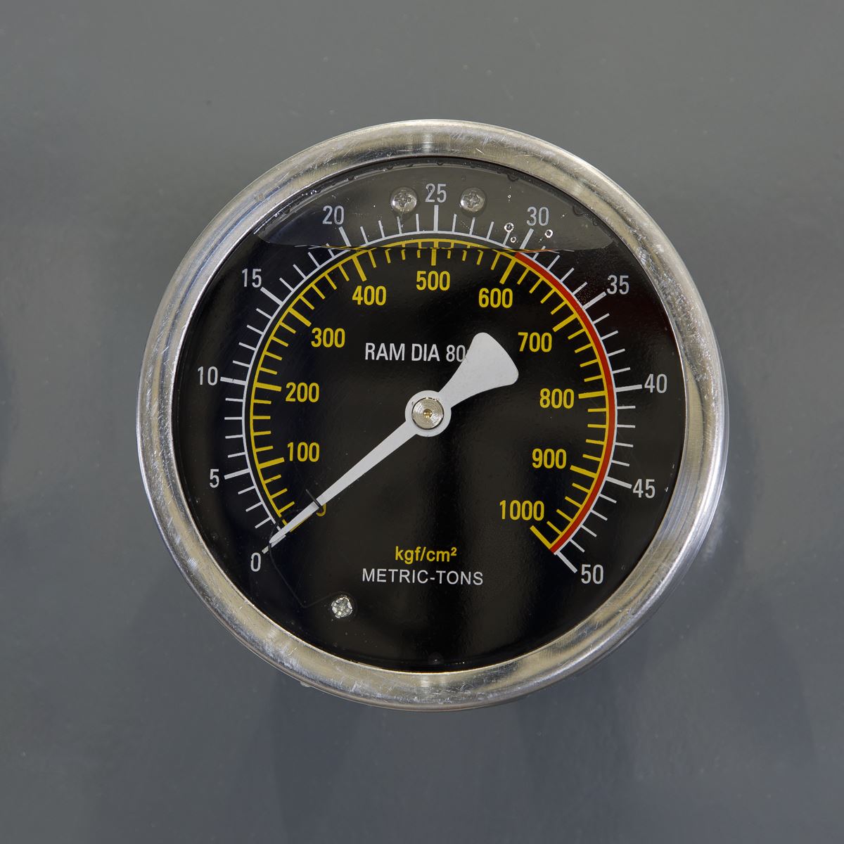 Steel frame construction with 2-speed hydraulic pump unit. Sliding hydraulic ram assembly giving 200mm of lateral travel for off-centre pressing applications. Fitted with ram pressure gauge and supplied with flat pressing plate/V-blocks.
