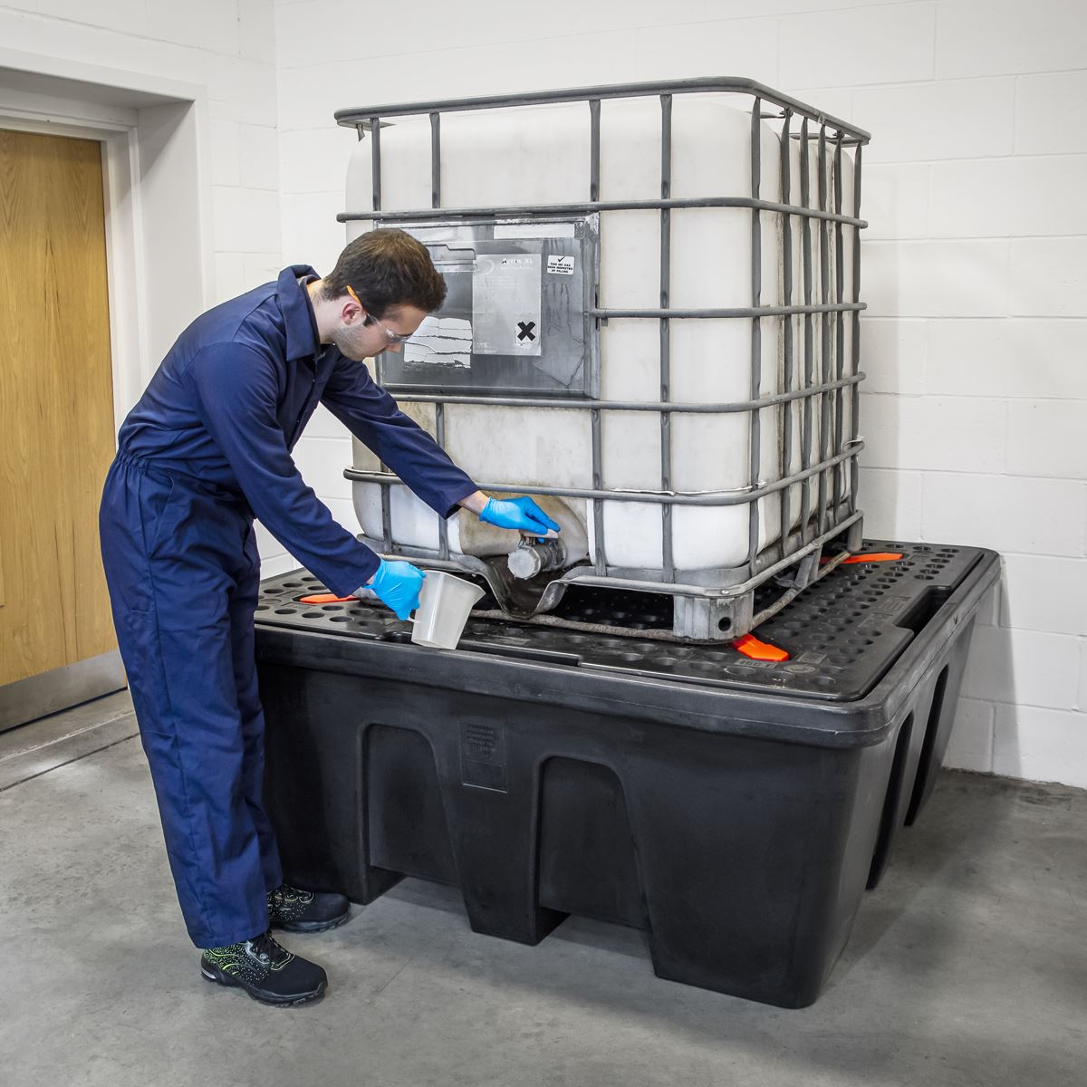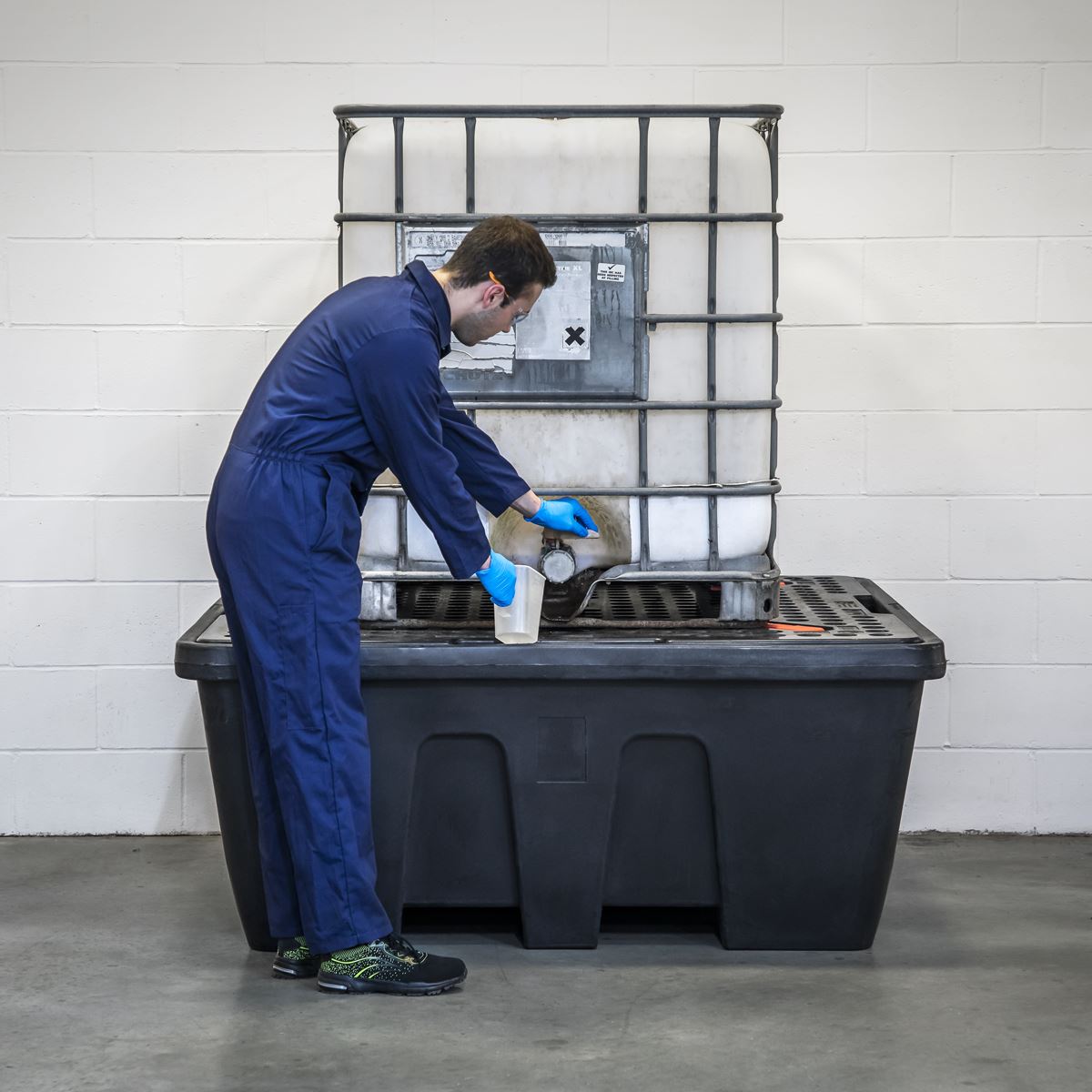 - Heavy-duty polyethylene IBC bund designed to catch and prevent spillages. - Constructed with raised dispensing area with 10L sump. - Features polyethylene centre support providing added strength and stability to load. - Manufactured with 1100L spill tray to comply with storage regulations. - Suitable for storage of 1 x IBC container. - Can be easily moved by forklifts and pallet trucks. - This item is heavy. Extra assistance must be provided at the delivery point to help its safe delivery. - Model No. DRP24 *This item is delivered direct from our factory. Delivery charges may apply. Contact our sales department for more details.- Heavy-duty polyethylene IBC bund designed to catch and prevent spillages. - Constructed with raised dispensing area with 10L sump. - Features polyethylene centre support providing added strength and stability to load. - Manufactured with 1100L spill tray to comply with storage regulations. - Suitable for storage of 1 x IBC container. - Can be easily moved by forklifts and pallet trucks. **** DIRECT DELIVERY - IMPORTANT PLEASE NOTE **** These products are manufactured to order and, due to the size, are delivered direct from our factory to all areas within the UK mainland. Please allow at least 15 working days for delivery and provide the full address, postcode, contact and telephone number for the place of delivery. N.B. Please call us initially for an individual carriage quote, as additional carriage charges may apply for some areas of Devon/Cornwall, Scotland, Wales and other areas due to remoteness of location; this may also extend delivery times.