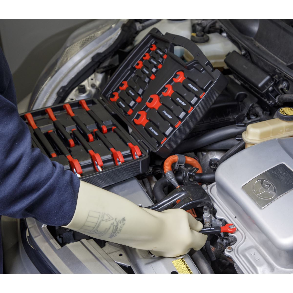 - Manufactured from hardened and tempered Chrome Vanadium steel. - Each spanner is fully insulated to VDE and EN 60900 standards to protect from electric shocks up to 1500V DC and 1000V AC. - Sizes: 7, 8, 9, 10, 11, 12, 13, 14, 15, 16, 17, 18, 19, 20, 21, 22, 23, 24mm. - Ideal for technicians working on modern hybrid and electrical vehicles (1500V DC safe live working). - Also suitable for electricians and other trades (1000V AC safe live working). - Supplied in storage case. - Lifetime guarantee*. - Model No. AK63172- One of a comprehensive range of Premier Hand Tools, suitable for daily professional use. - Manufactured from hardened and tempered Chrome Vanadium steel. - Each spanner is fully insulated to VDE and EN 60900 standards to protect from electric shocks up to 1500V DC and 1000V AC. - Ideal for technicians working on modern hybrid and electrical vehicles (1500V DC safe live working). - Also suitable for electricians and other trades (1000V AC safe live working). - Supplied in storage case. - Lifetime guarantee*.