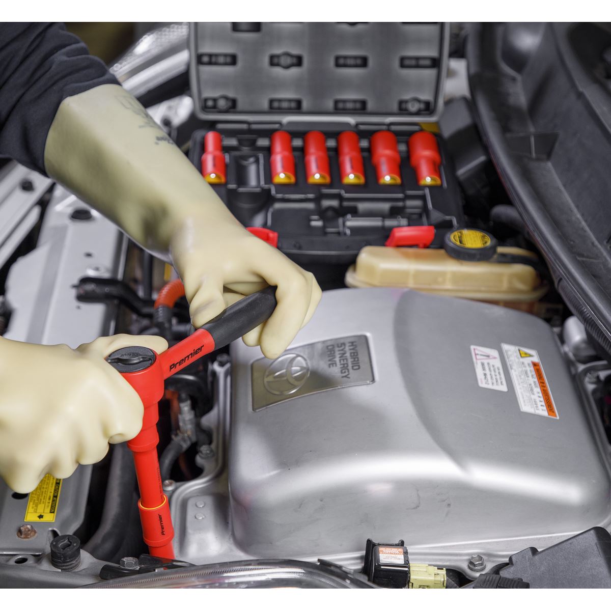 - Hardened and tempered Chrome Vanadium steel sockets and accessories. - Each component is fully insulated to VDE and EN 60900 standards to protect from electric shocks up to 1500V DC and 1000V AC. - Contents: Sockets; 8, 10, 12, 13, 14, 17, 19mm, Flip Reverse Comfort Grip Ratchet Wrench with Push-Button Quick Release, 100mm Extension Bar. - Ideal for technicians working on modern hybrid and electrical vehicles (1500V DC safe live working). - Also suitable for electricians and carpenters (1000V AC safe live working). - Supplied in storage case. - Lifetime guarantee*. - Model No. AK7942- One of a comprehensive range of Premier Hand Tools, suitable for daily professional use. - Hardened and tempered Chrome Vanadium steel sockets and accessories. - Each component is fully insulated to VDE and EN 60900 standards to protect from electric shocks up to 1500V DC and 1000V AC. - Covers sizes from 8 to 19mm. - Includes flip reverse comfort grip ratchet wrench with push-button quick release and 100mm extension bar. - Ideal for technicians working on modern hybrid and electrical vehicles (1500V DC safe live working). - Also suitable for electricians and carpenters (1000V AC safe live working). - Supplied in storage case. - Lifetime guarantee*.