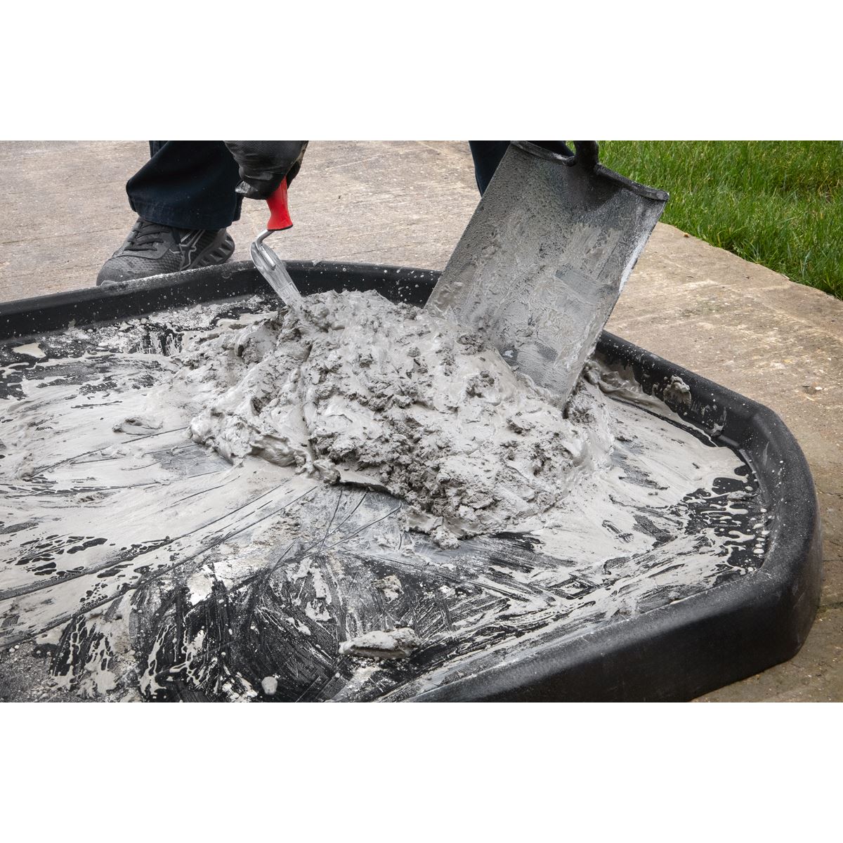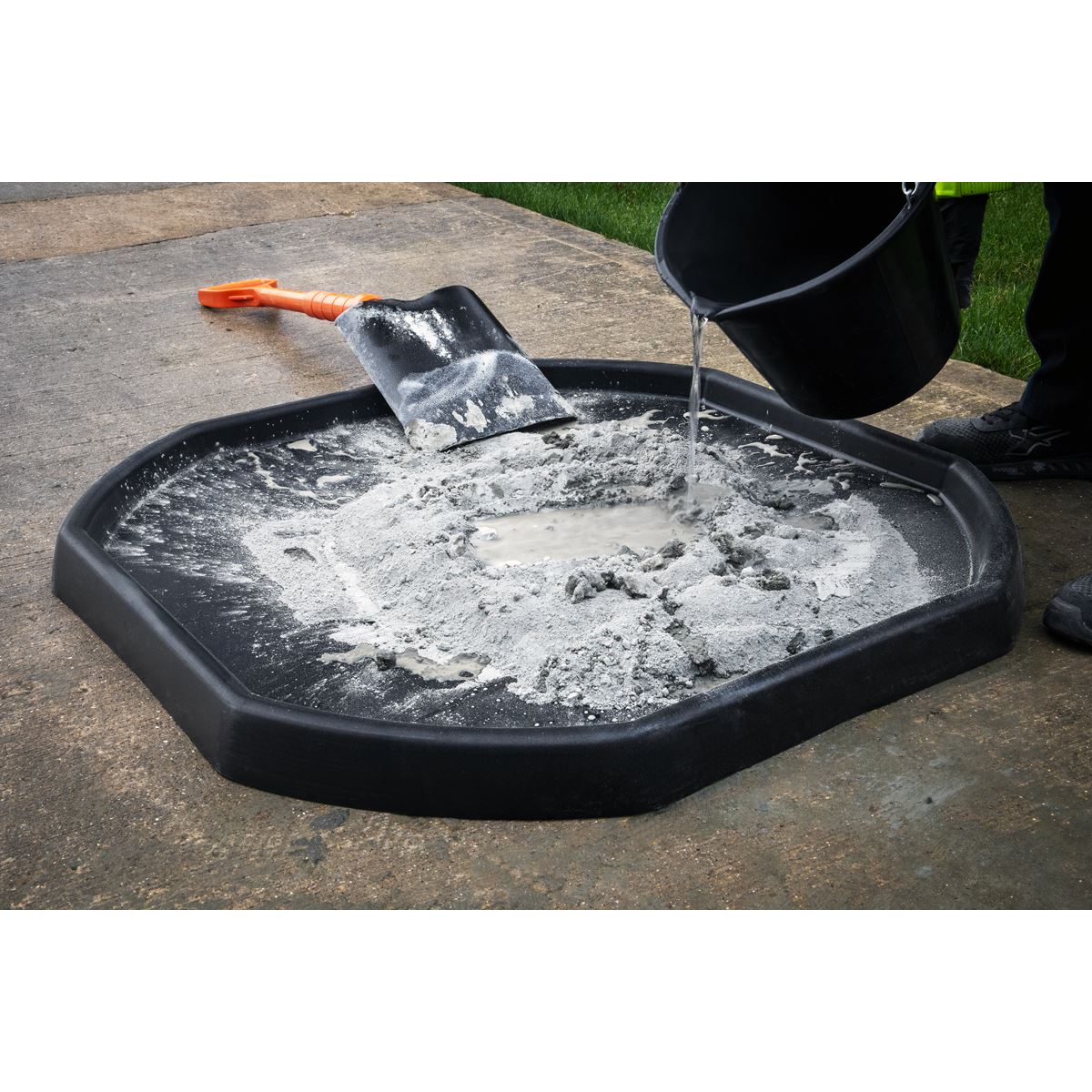 Builders mixing board for cement and mortar. Raised edges help restrict spillages. Easy-to-carry, lightweight material with a smooth simple wipe-clean finish. Also suitable for use around the home and garden.