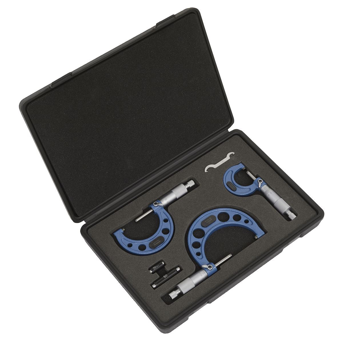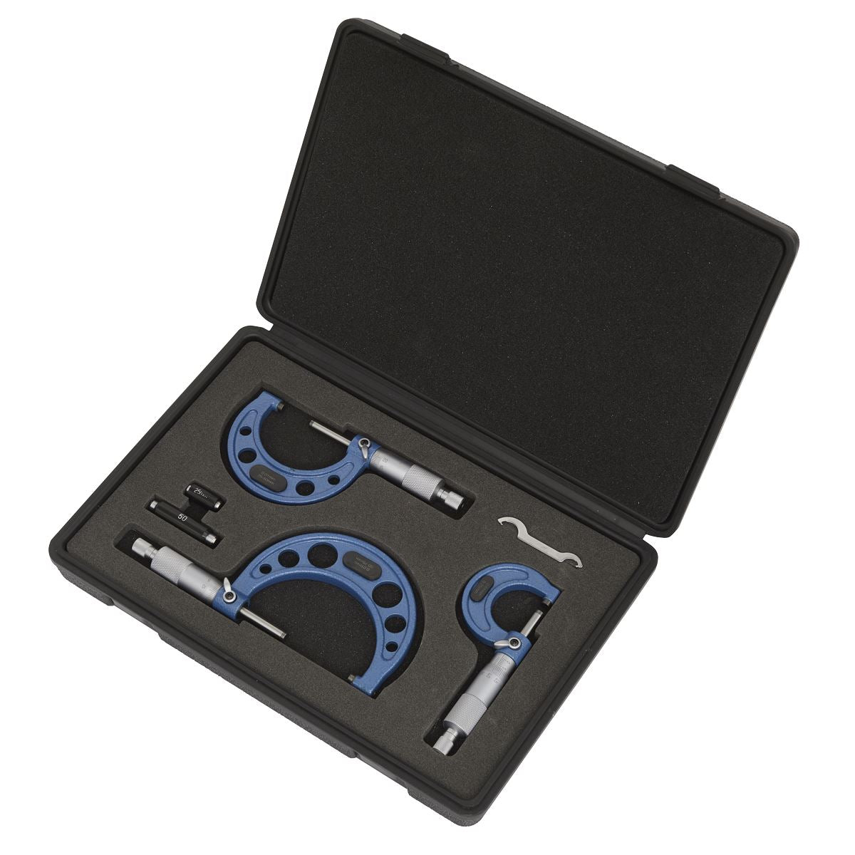 - Set includes three external micrometers ranging from 0-75mm. - Supplied with extension sets and adjusting wrench. - Lifetime guarantee*. - Model No. AK9651M- Set comprising Metric micrometers from the standard range. - Supplied in foam lined, storage case with two calibrated extension bars and thimble wrench. - Lifetime guarantee*.