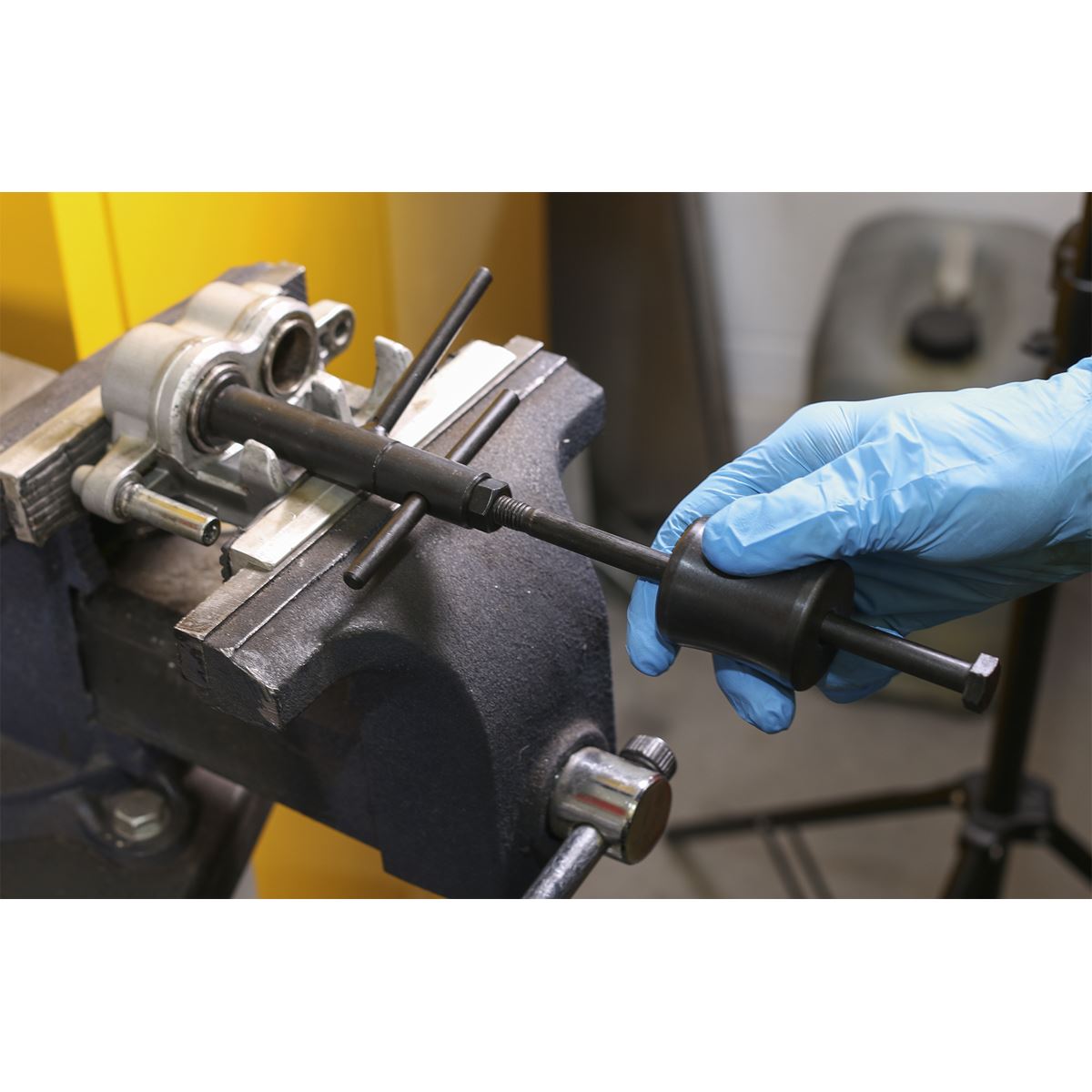 Extract brake caliper pistons without risk of damage to outer face of piston. Fast and simple operation. Features detachable slide hammer for impact removal. The kit includes 12 adaptors to suit different sized pistons.
