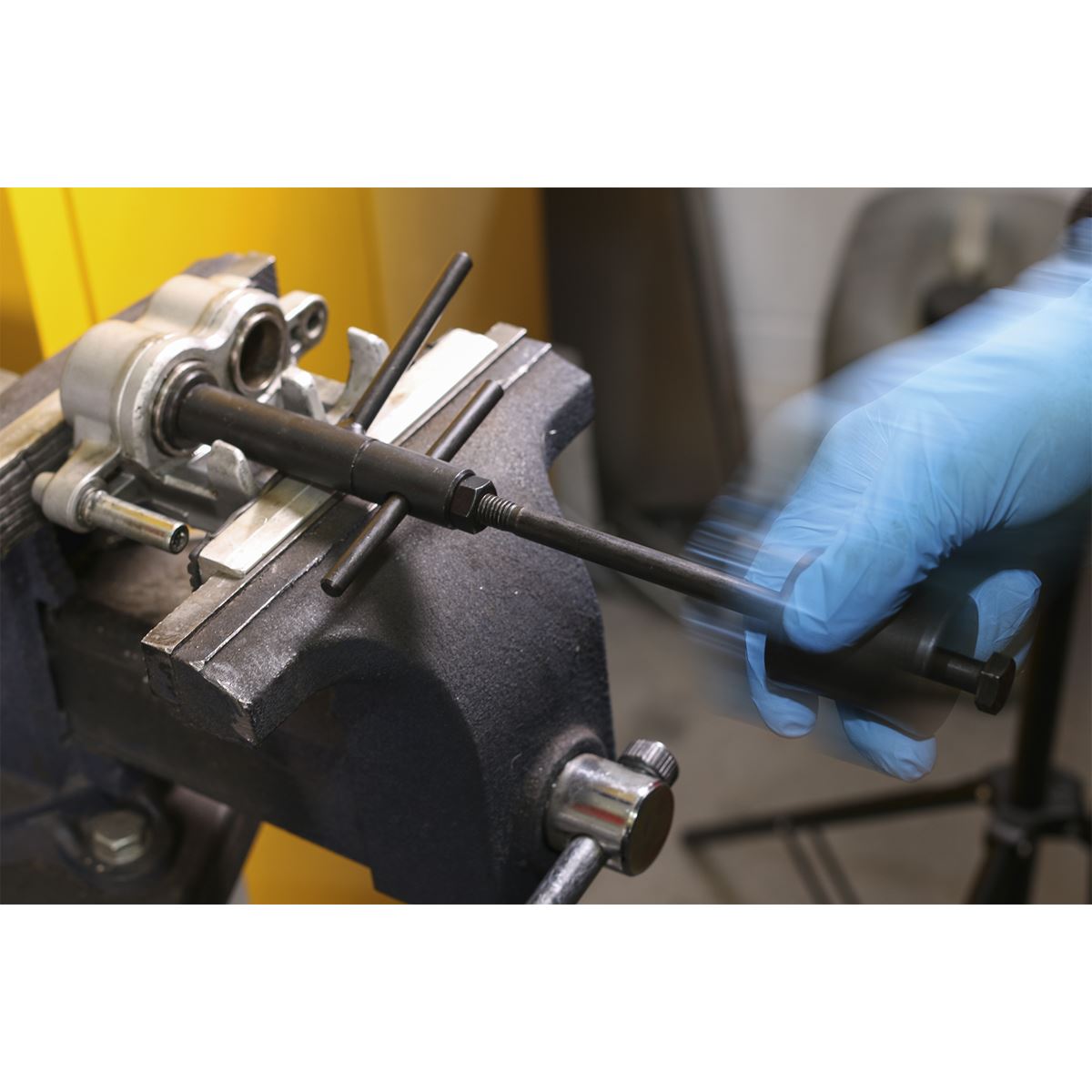 - Designed to reduce the time taken when removing piston from motorcycle brake calipers. - Extract brake caliper pistons without risk of damage to outer face of piston. - Includes 12 adaptors to suit different sized pistons. - Detachable slide hammer for impact removal. - Capacity: 19-30mm. - Model No. MS162- Extract brake caliper pistons without risk of damage to outer face of piston. - Includes 12 adaptors to suit different sized pistons. - Detachable slide hammer for impact removal.