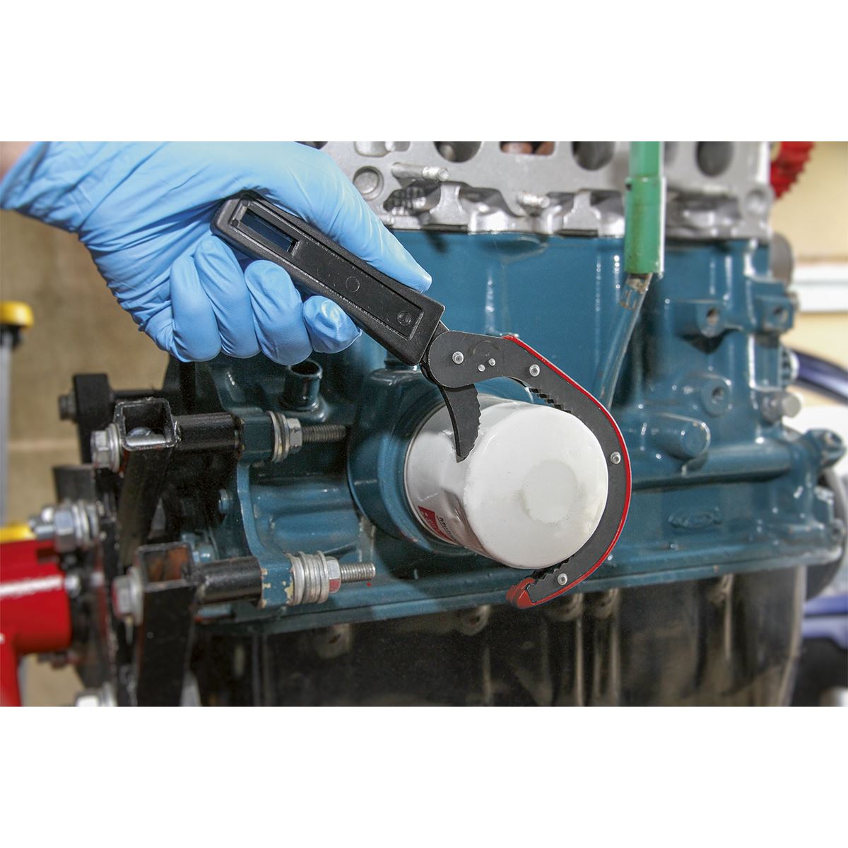 Spring loaded serrated jaws provide firm grip to oil filter. Slim design allows access in tight spaces.