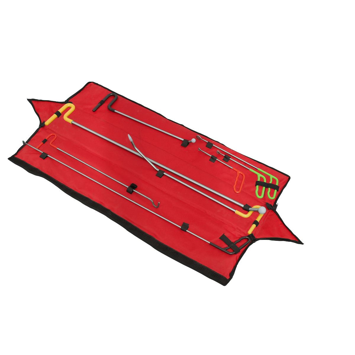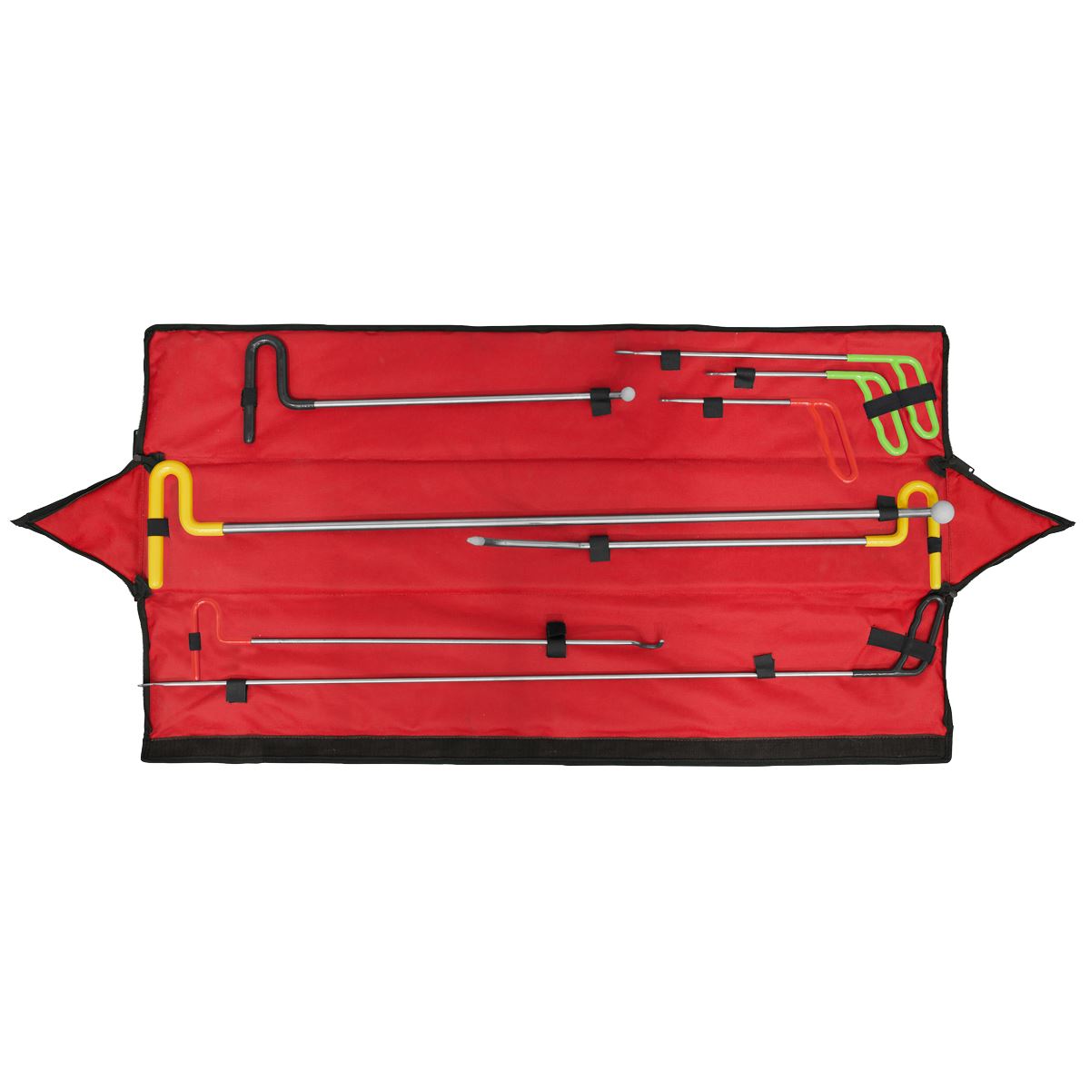 - Heavyweight, heat treated, high quality steel components are carefully shaped and finished to allow the technician (with practice) to coax out all manner of dents and creases from behind the body panel, without the need to respray/refinish the painted surface. - Time-saving kit supplied in storage bag. - Contents: Flare Tip; 6", 7", 12", Serrated Flare Tip; 38", 90 Hook; 22", 45 Hook Tip Extension; 16", Angled Tip Extension; 20", 37". - Model No. RE103- Heavyweight, heat treated, high quality steel components are carefully shaped and finished to allow the technician (with practice) to coax out all manner of dents and creases from behind the body panel, without the need to respray/refinish the painted surface. - Time-saving kit supplied in storage bag.