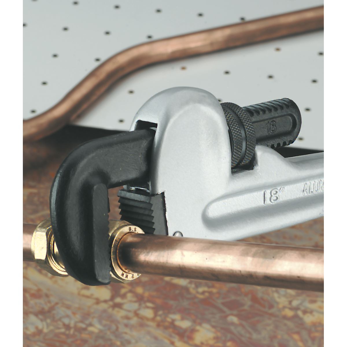 European pattern pipe wrench. Gravity cast aluminium alloy handle has the strength of steel but at 2/3rds the weight. Drop-forged high carbon steel jaws with tool steel spring.