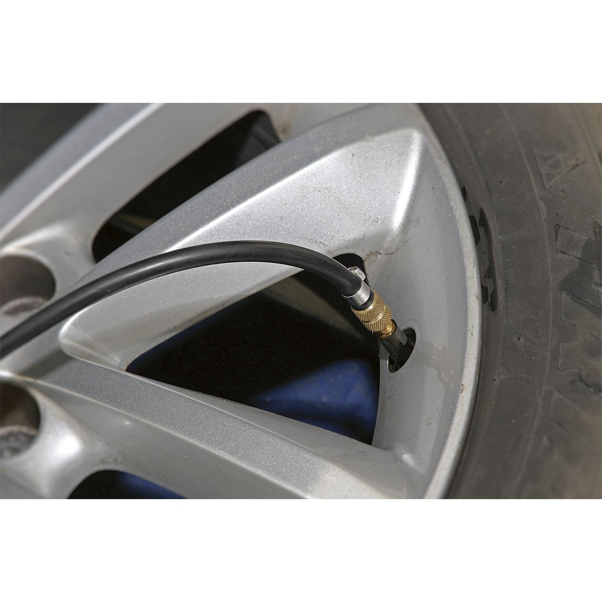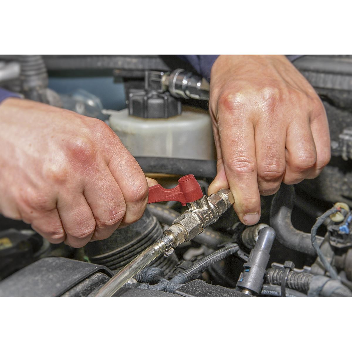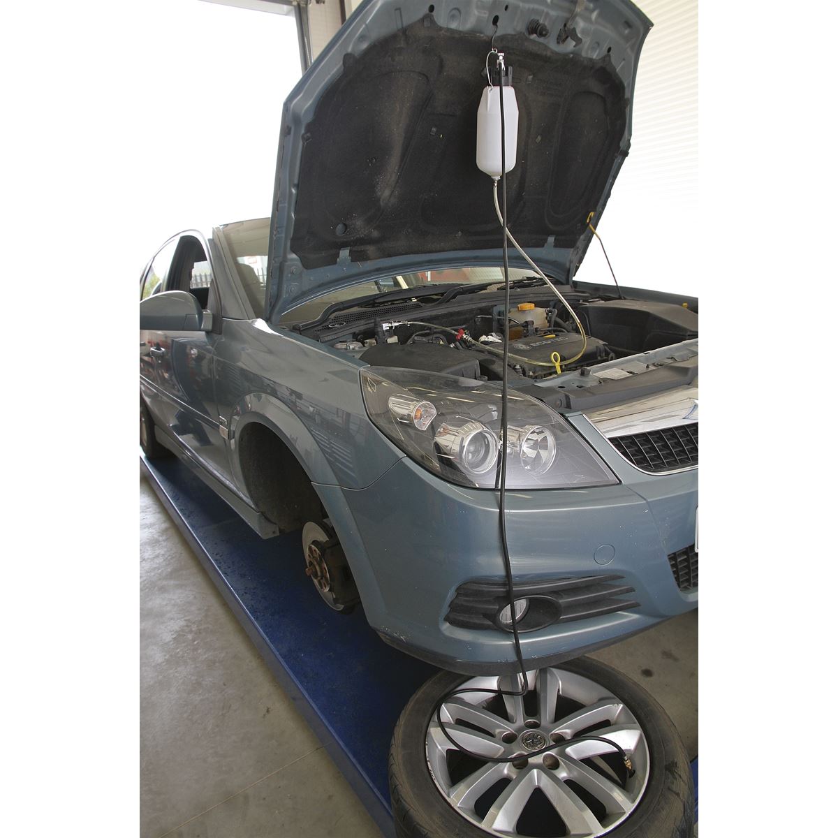 Professional one-person brake and clutch bleeder that uses air from the vehicle tyre. Reservoir holds 1.5L of hydraulic fluid - flush the entire system with one fill without the risk of running the reservoir dry. Maximum pressure of 30psi makes the unit suitable for ABS systems. Features a fluid shut-off valve to prevent accidental spillage and air pressure release valve. Fitted with 45mm cap with 90 angled connector which is suitable for most European models. For other applications order optional Brake Reservoir Cap 45mm Straight Connector - Model No. VS820SA, Universal Adaptor - Model No. VS820UA and Bleeder Cap Set - Model No. VS0204B.