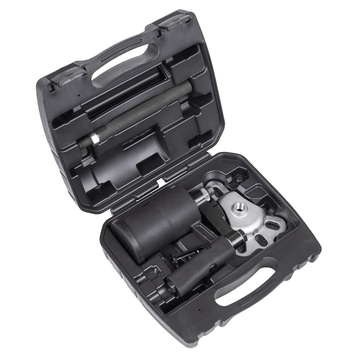 Pneumatic system uses slide hammer action to remove seized hubs. Cast iron ductile body with steel force screw and extension bar. Suitable for four and five stud hubs. Supplied in storage case.