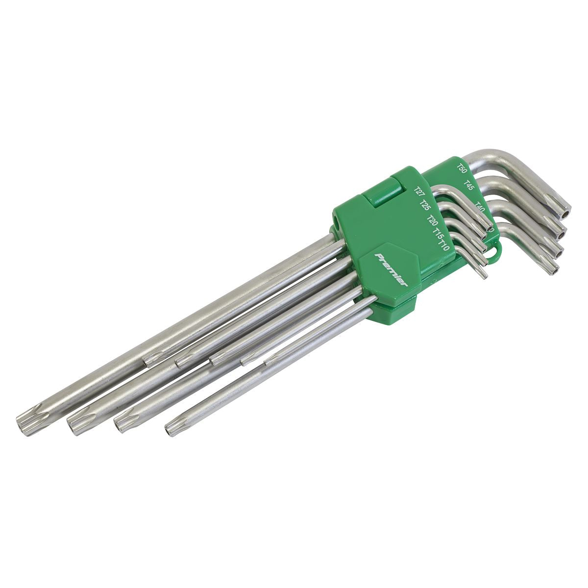 - Manufactured from heat treated and hardened Chrome Vanadium steel with satin chrome finish. - Keys range in length from 92mm to 232mm and in size from T10H to T50H. - Supplied in easy-access case with hanging tag for safe storage and quick key selection. - Contents: T10H, T15H, T20H, T25H, T27H, T30H, T40H, T45H, T50H. - Lifetime guarantee*. - Model No. AK7163- One of a comprehensive range of Premier Hand Tools, suitable for daily professional use. - Manufactured from heat treated and hardened Chrome Vanadium steel with satin chrome finish. - Keys range in length from 92mm to 232mm and in size from T10H to T50H. - Supplied in easy-access case with hanging tag for safe storage and quick key selection. - Lifetime guarantee*.