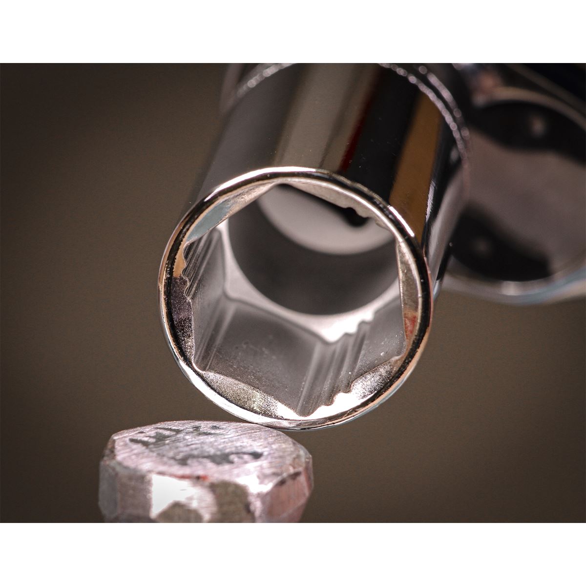 Manufactured from hardened and tempered high grade Chrome Vanadium 6142 steel. Fully polished mirror finish for resistance to corrosion. Features specially machined flutes in the walls of the socket which enable use on up to 85% rounded fasteners. This not only provides added strength but also prevents damage to worn or rusted fixings. Includes knurled ring for extra grip with oily fingers. Supplied on socket rail.