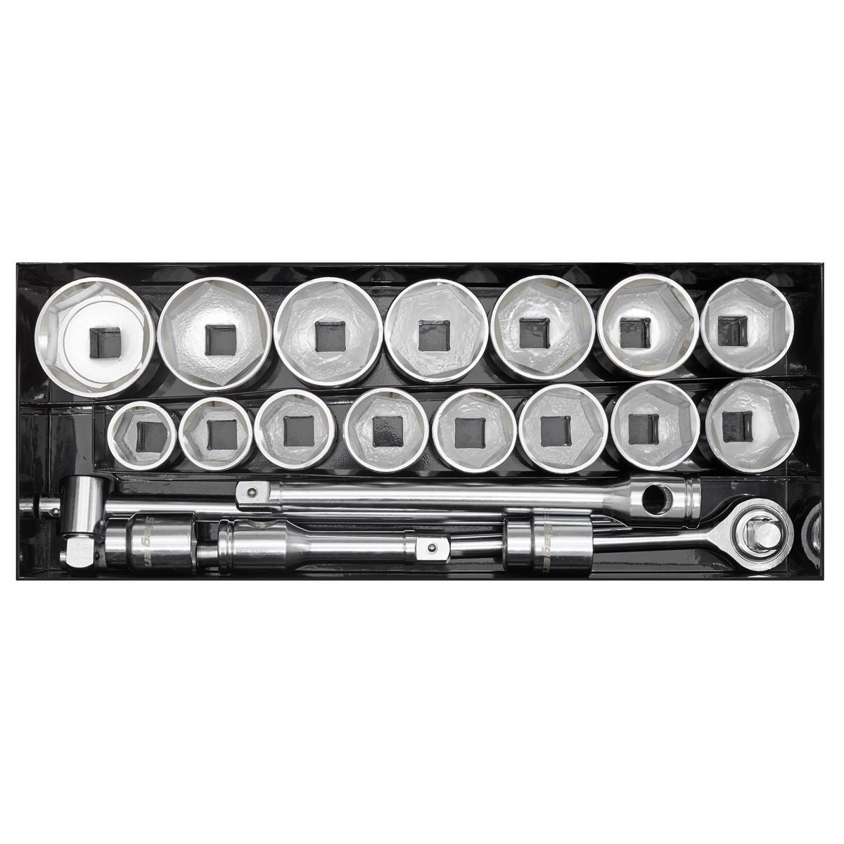 - Heat treated, drop-forged, Chrome Vanadium steel with fully polished chrome plating for corrosion resistance. - Contents: 6-Point Standard Sockets; 36, 38, 41, 46, 50, 54, 55, 58, 60, 63, 65, 67, 70, 71, 75, 77, 80mm, Extension Bars; 200, 400mm, Sliding T-Bar, 1"Sq Drive Twist-Reverse Ratchet Wrench. - Supplied in metal storage case. - Lifetime guarantee*. - Model No. S0768- Part of the Siegen by Sealey range of quality tools at competitive prices. - Heat treated, drop-forged, Chrome Vanadium steel with fully polished chrome plating for corrosion resistance. - Seventeen 6-point WallDrive sockets, ratchet wrench with twist-reverse, extension bars and sliding T-bar. - Supplied in metal storage case. - Lifetime guarantee*.