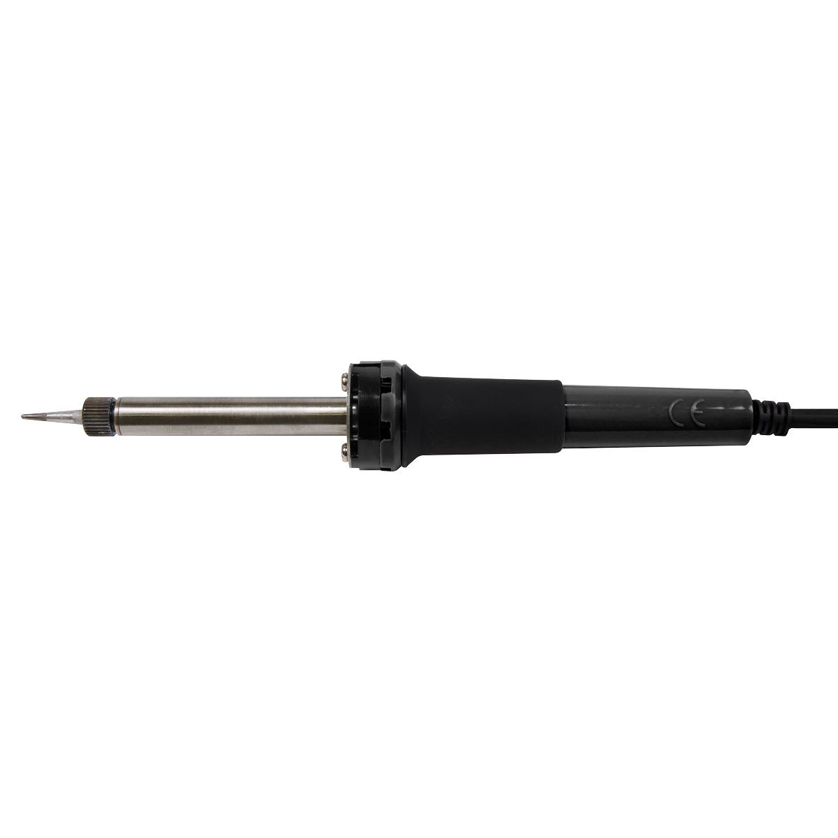 48W Soldering station with rapid heat up. Variable temperature control. Maintains temperatures between 160-480C. Supplied with a metal soldering iron stand, tip sponge and replaceable tip.