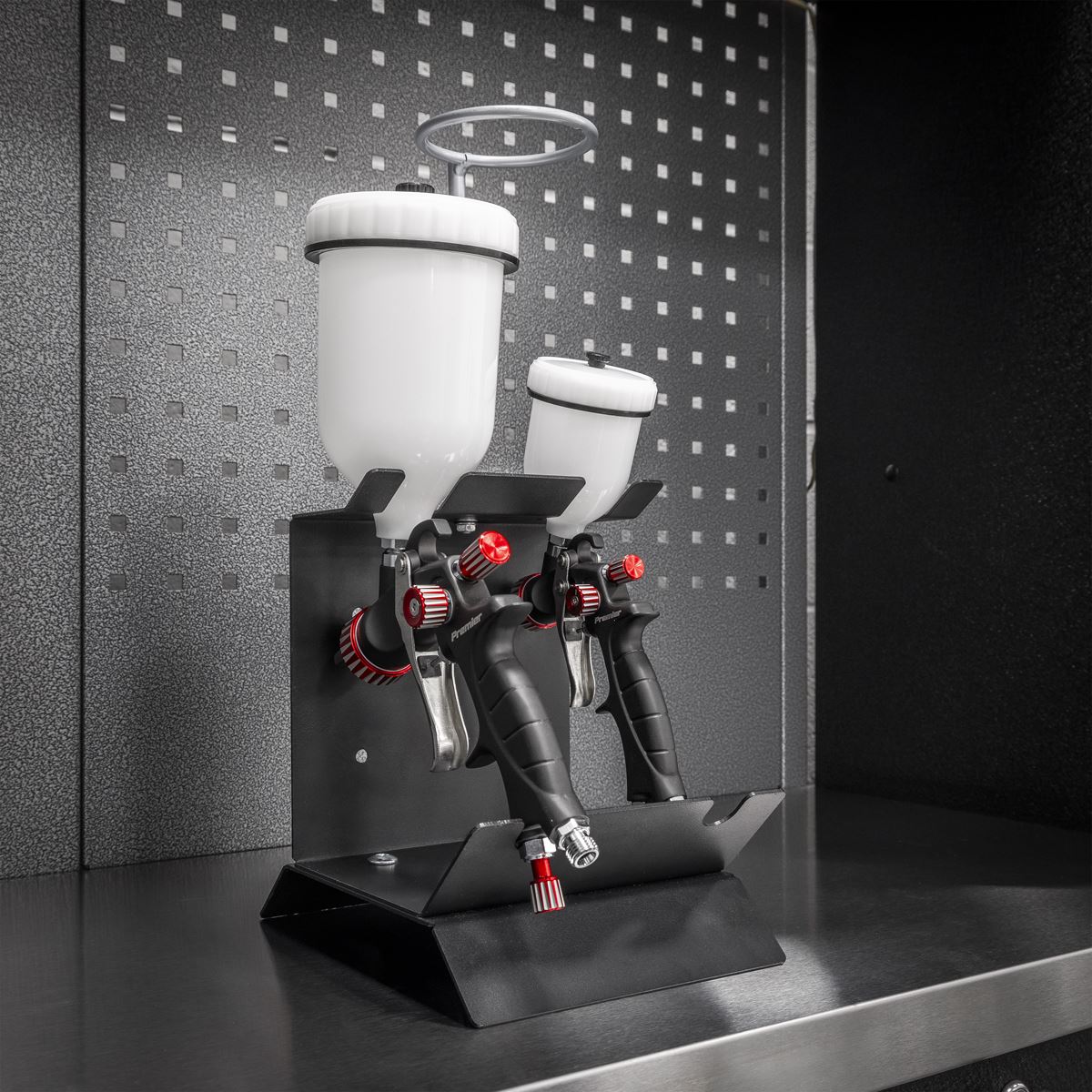 Bench or wall-mounting design with adjustable filter holder ring provides flexible options for setting up your spray gun holder in any workspace. Firmly supports two full-size spray guns and prevents accidental tipping or spillage. Lightweight yet sturdy construction allows for easy movement and repositioning.