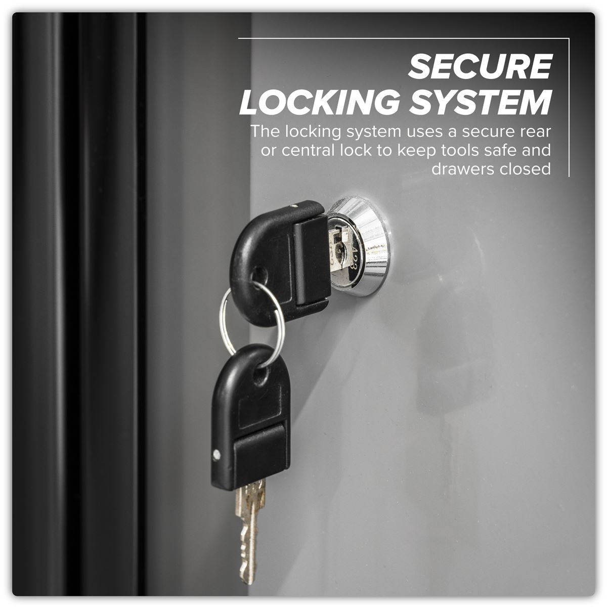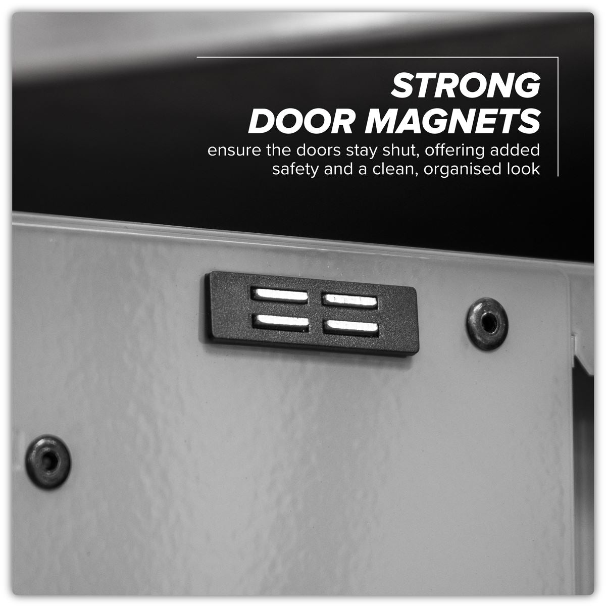 Tough and durable construction with a high gloss powder coated finish. Black anodized aluminium handles and drawer pulls. Drawers fitted with soft close ball-bearing drawer slides. 38mm stainless steel worktop. Gas struts on wall cabinet doors. This item is heavy. Extra assistance must be provided at the delivery point to help its safe delivery.