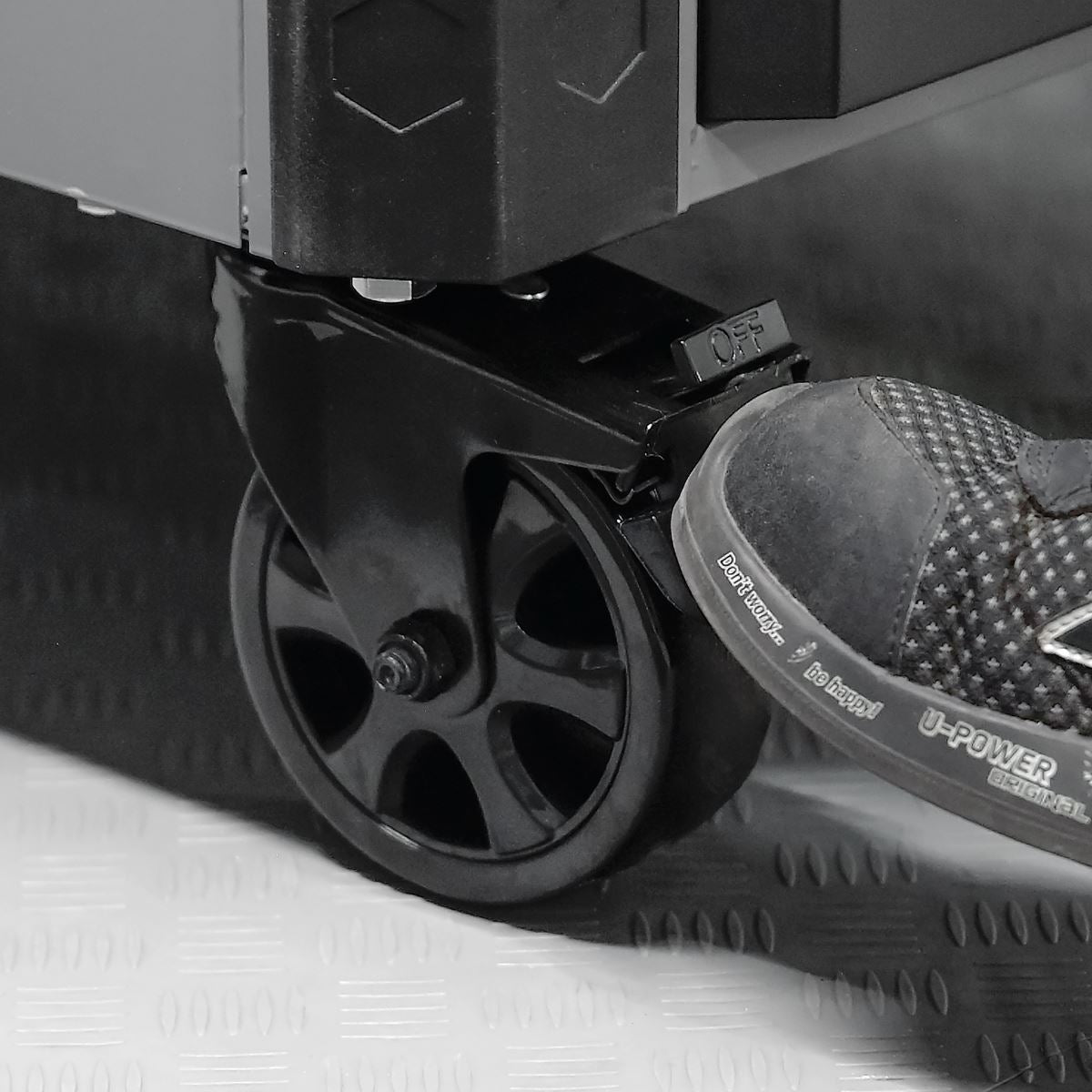 Manufactured from double skin side walls. Full length locking bars secure all drawers when the lid is closed which can then be locked by the barrel lock supplied with two keys. Coated in high-gloss triple baked enamel for protection against oil, dirt and mild solvents. Full length TPR anti-shock protective bumpers on all corners prevent damage when moving around the workshop. Fitted with four stylish 5" x 2" castors, two fixed and two swivel with brakes and a durable shatterproof plastic side handle. Supplied with a can storage tray, waste bin and paper roll holder. Six soft close drawers each supplied with a cut-to-size non-slip liner. Deep storage compartment inside of the gas strut lid supplied with non-slip liner.