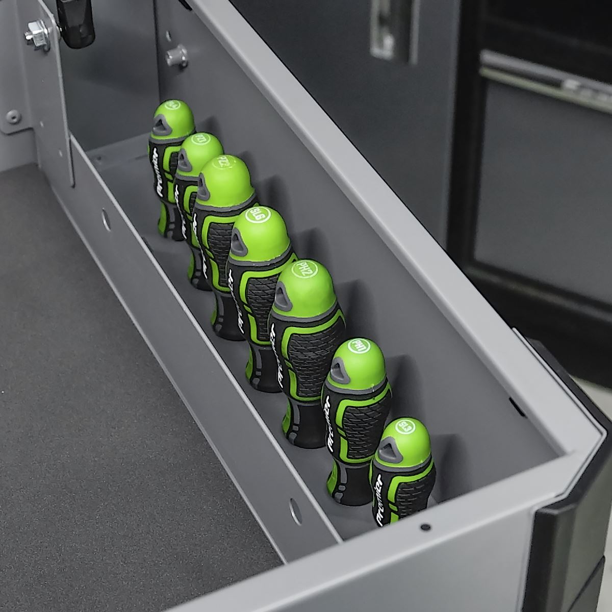 • Full length locking bars secure all drawers when the lid is closed which can then be locked by the barrel lock supplied with two keys.